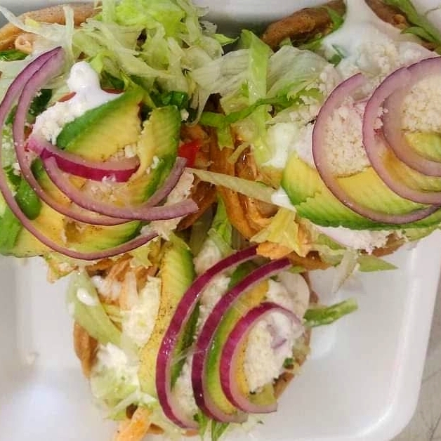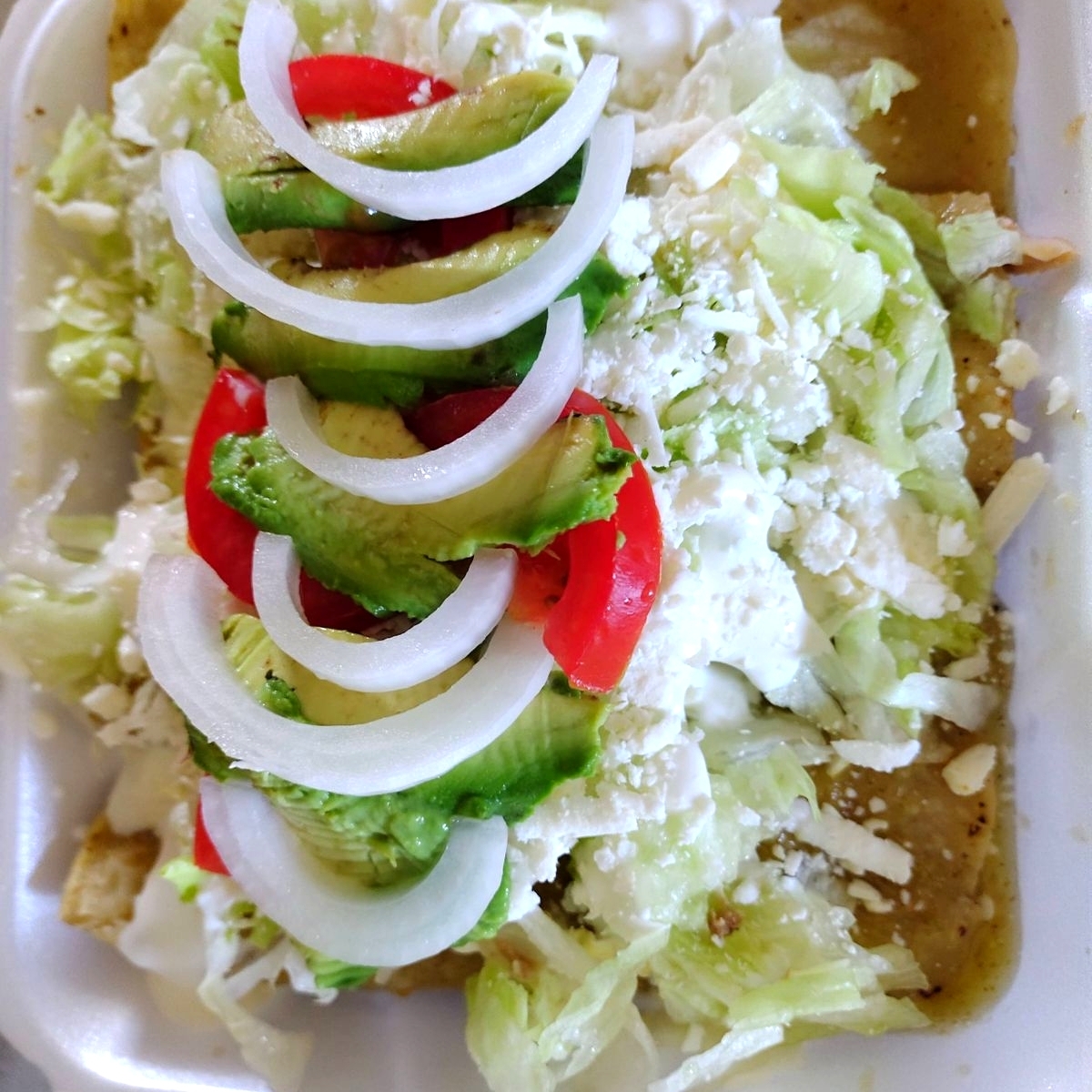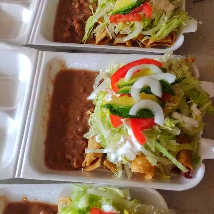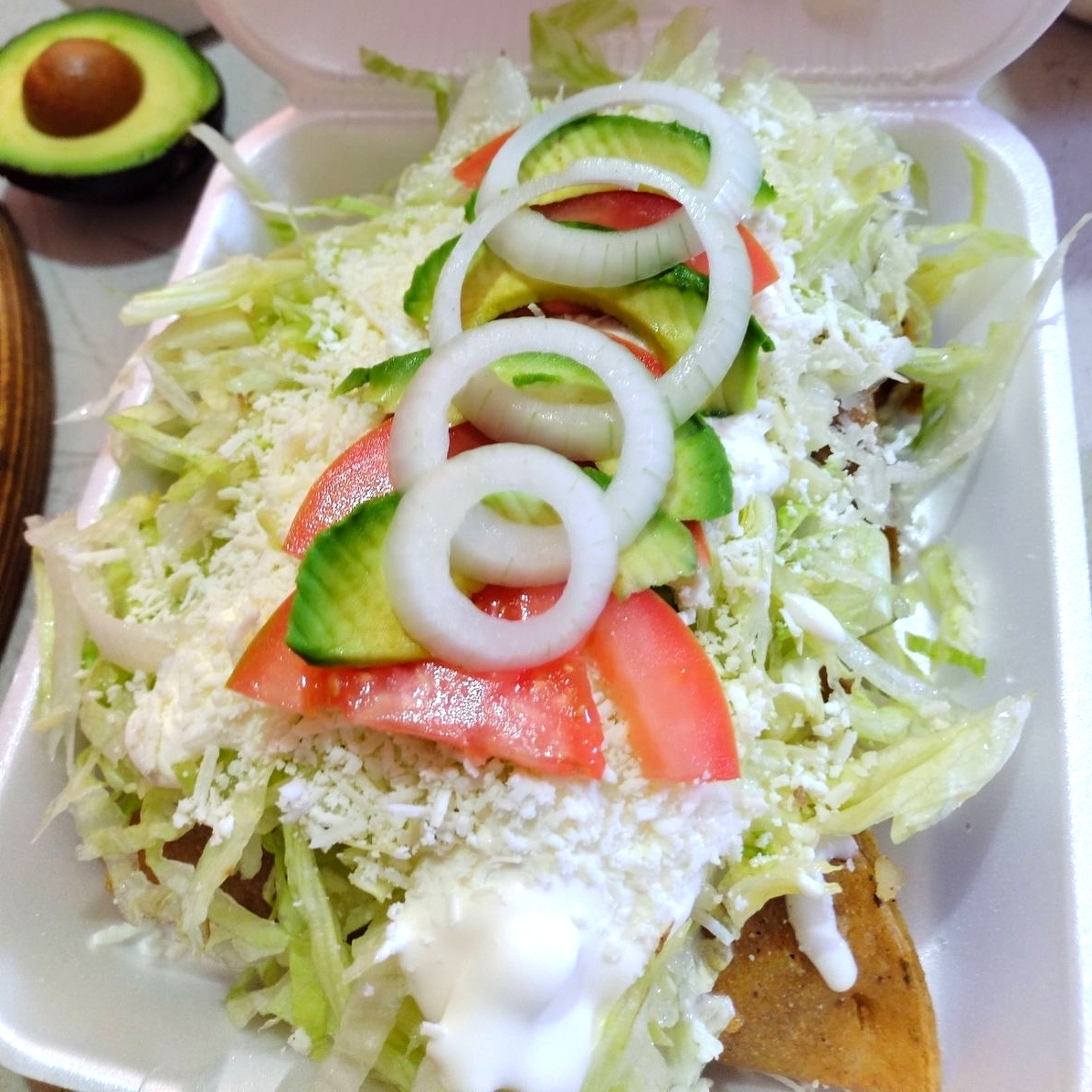 4 flautas de pollo, crema,lechuga,queso cotija,tomate, cebolla y aguacate