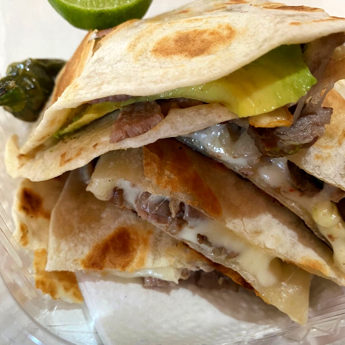 Tortilla arina carne asada queso Monterrey fundido lechuga tomate cebolla y aguacate