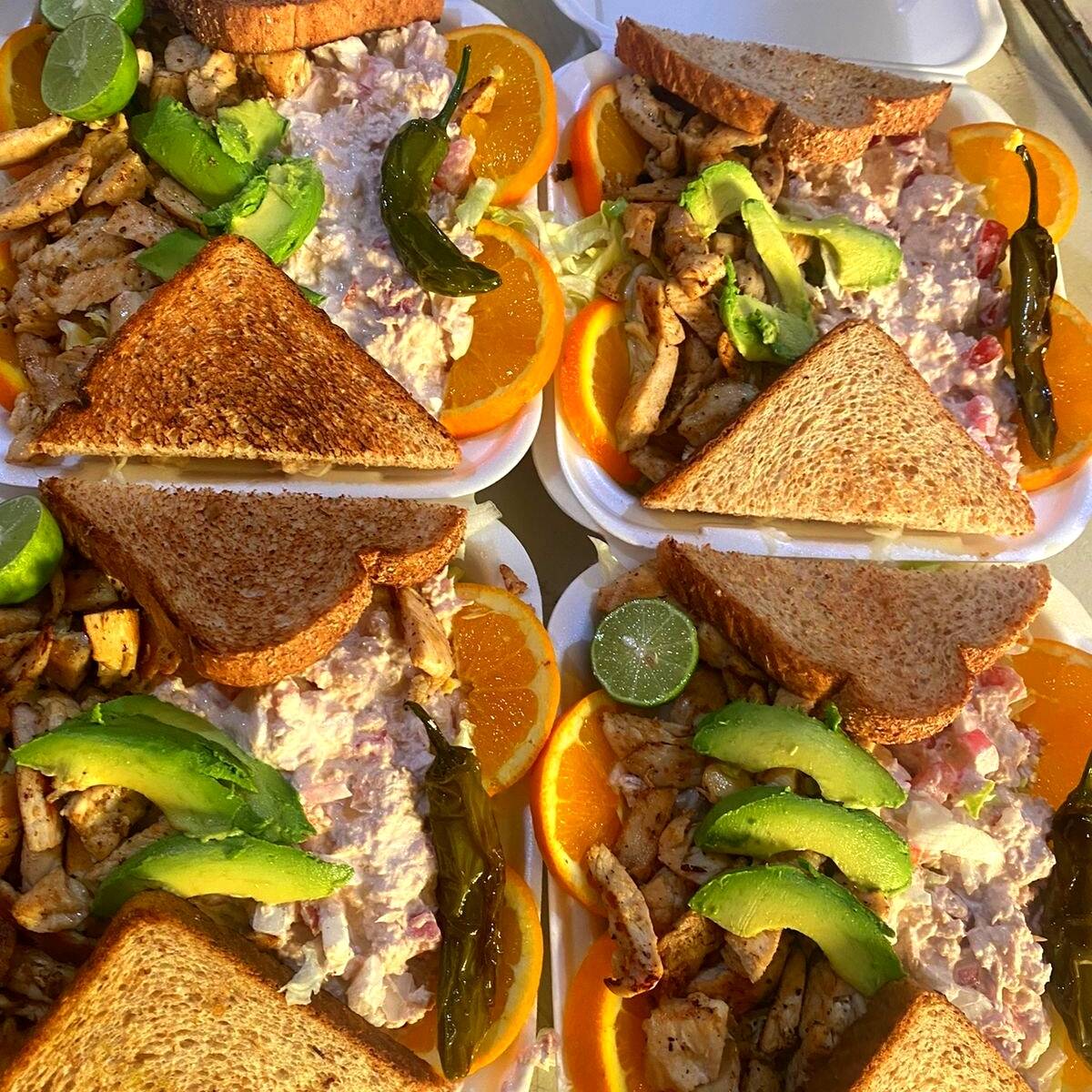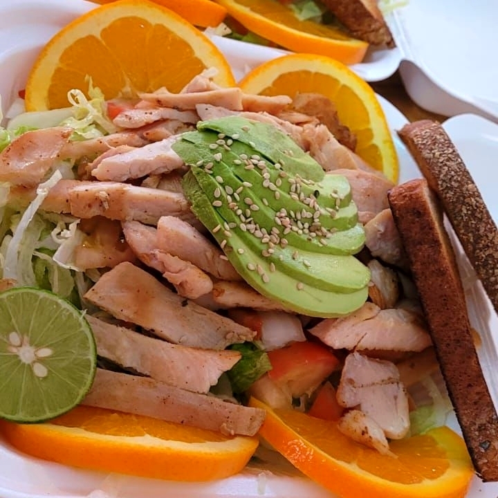 Cama de lechuga tomate cebolla naranja pechuga pan integral aguacate y aderezó