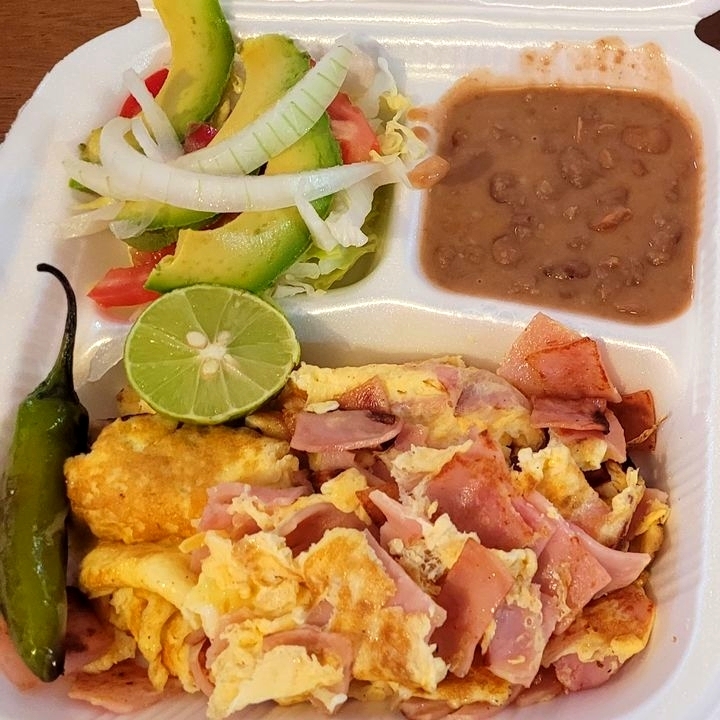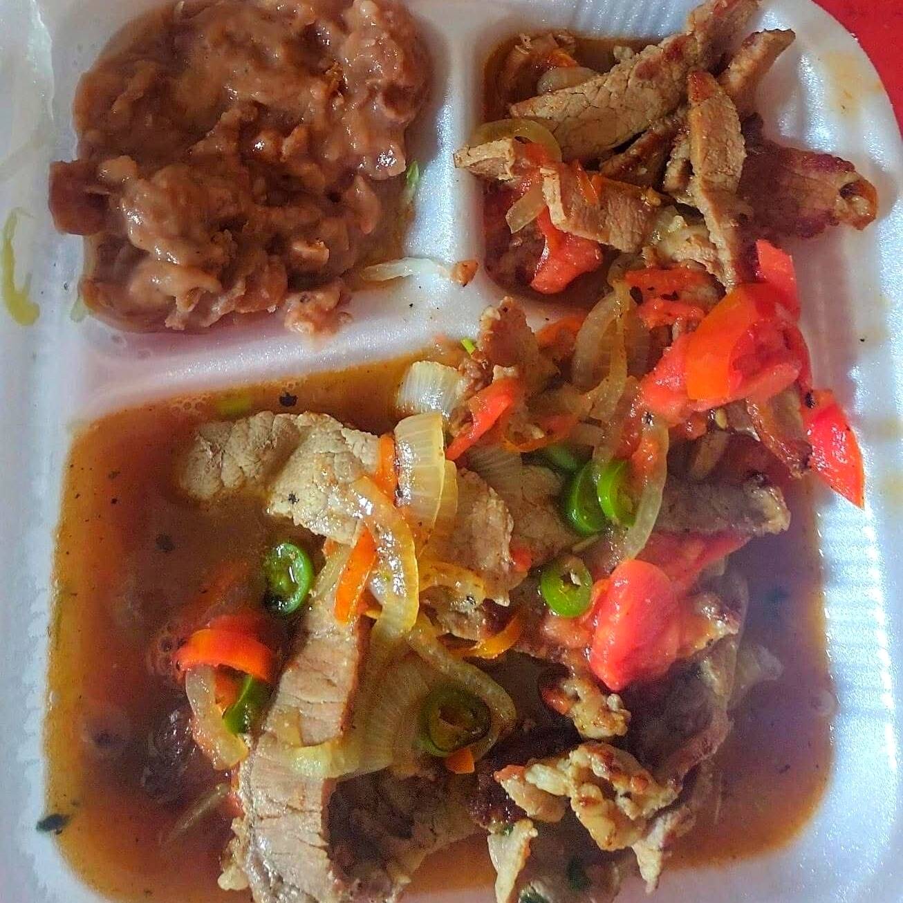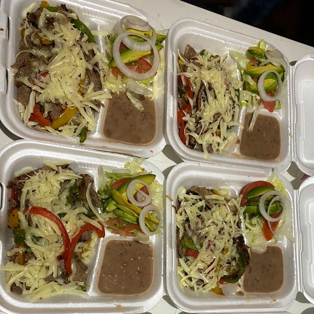 Carne asada,pimiento,cebolla y queso gratinado,acompañado con frijoles y ensalada(lechuga, tomate, cebolla y aguacate