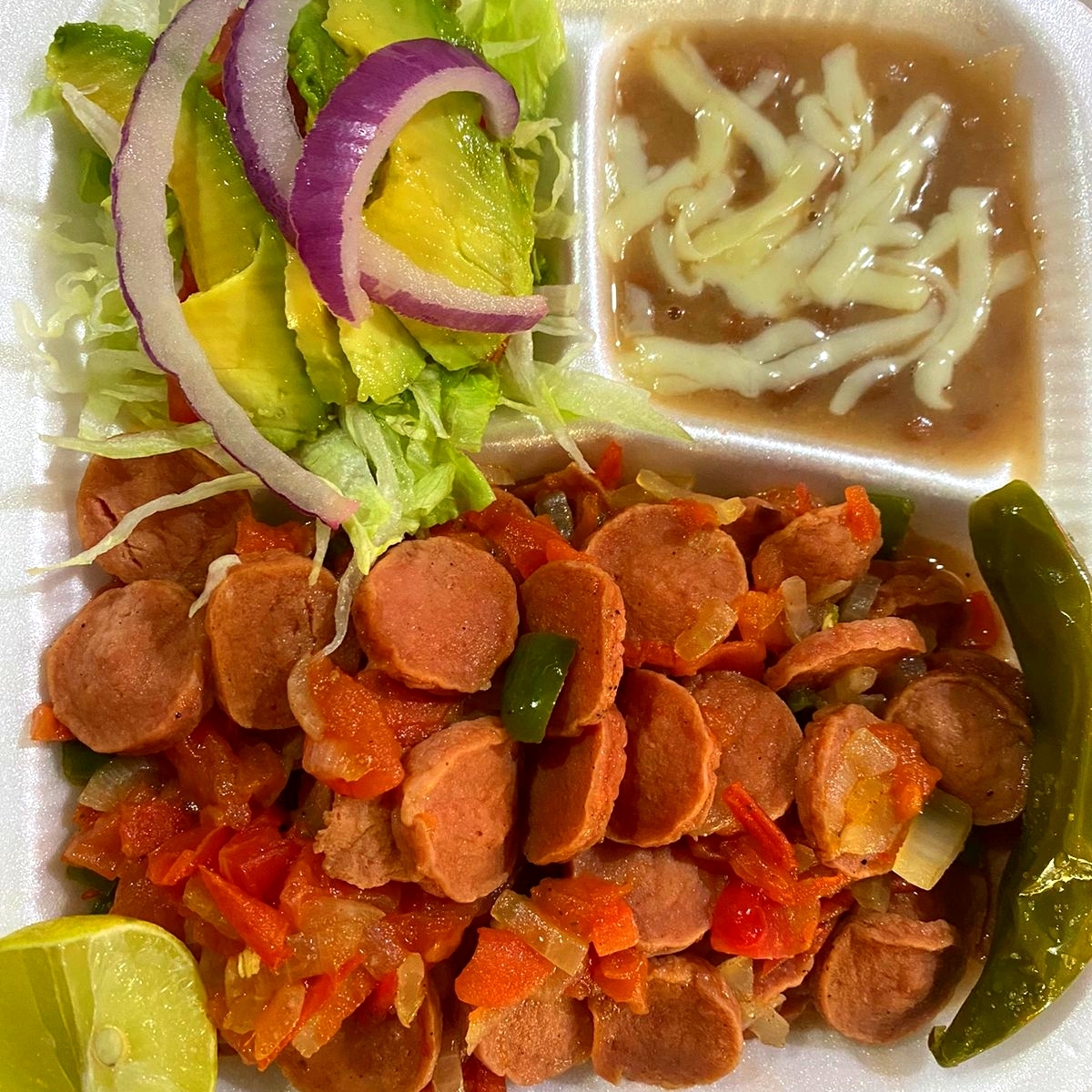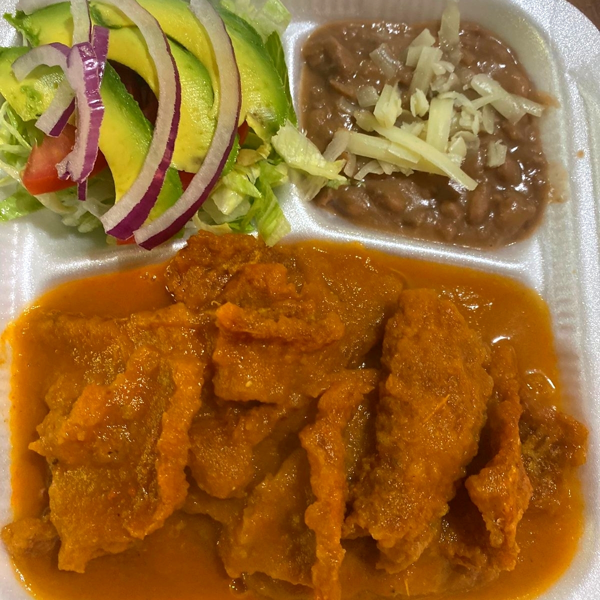 Chicharron guisado en salsa roja,acompañado,con una ensalada(lechuga,tomate,cebolla y aguacate) y frijoles
