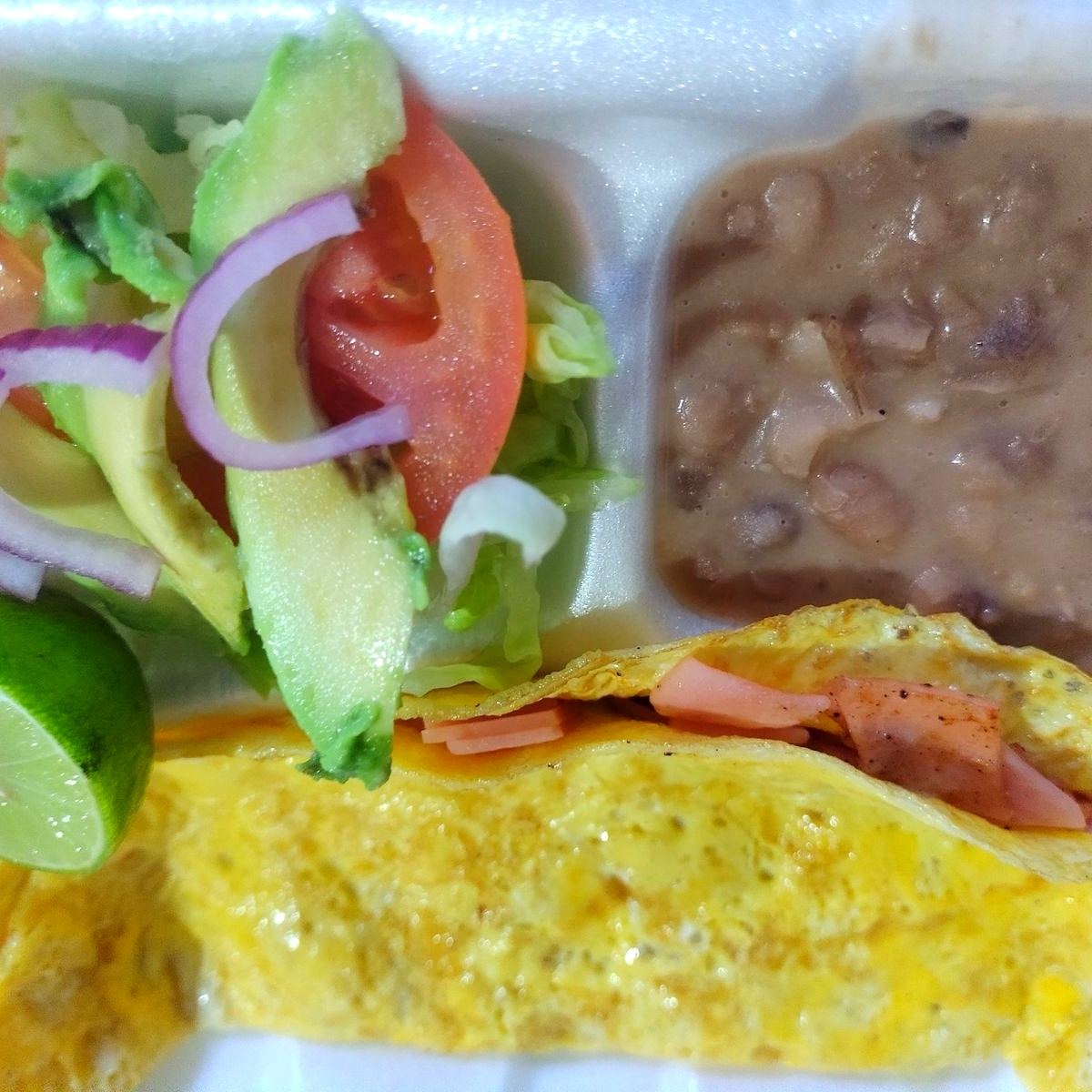 Pan, mayonesa,huevo revuelto con jamón,queso amarillo, lechuga, tomate, cebolla y aguacate