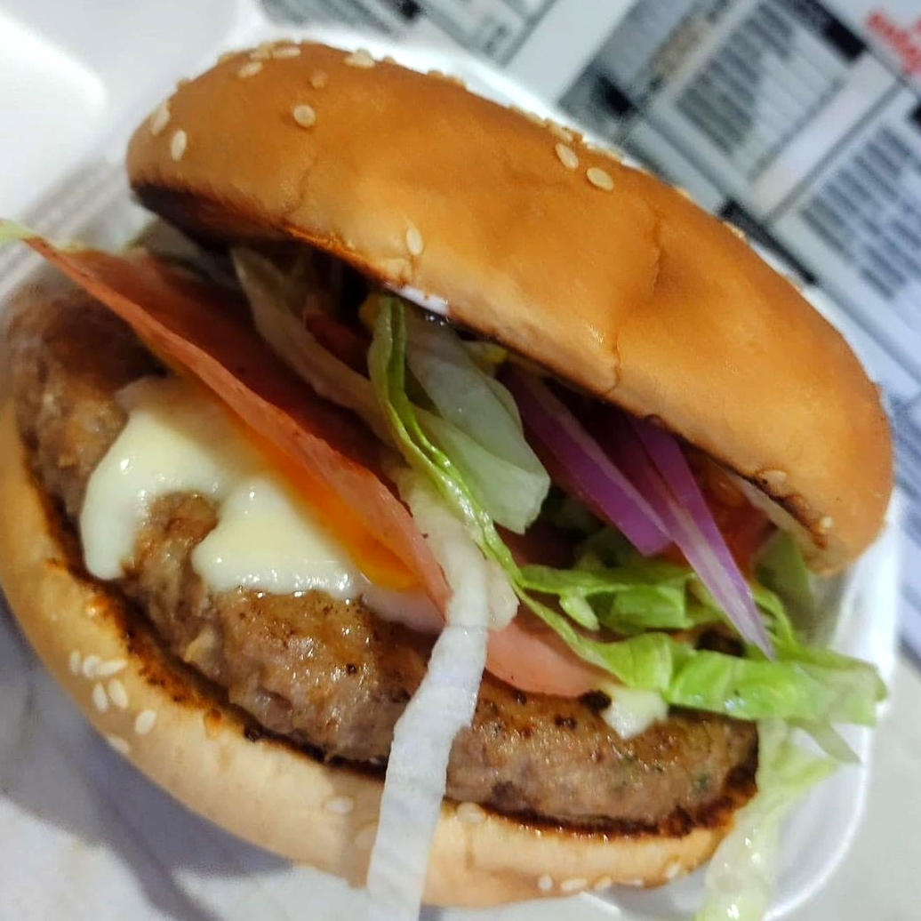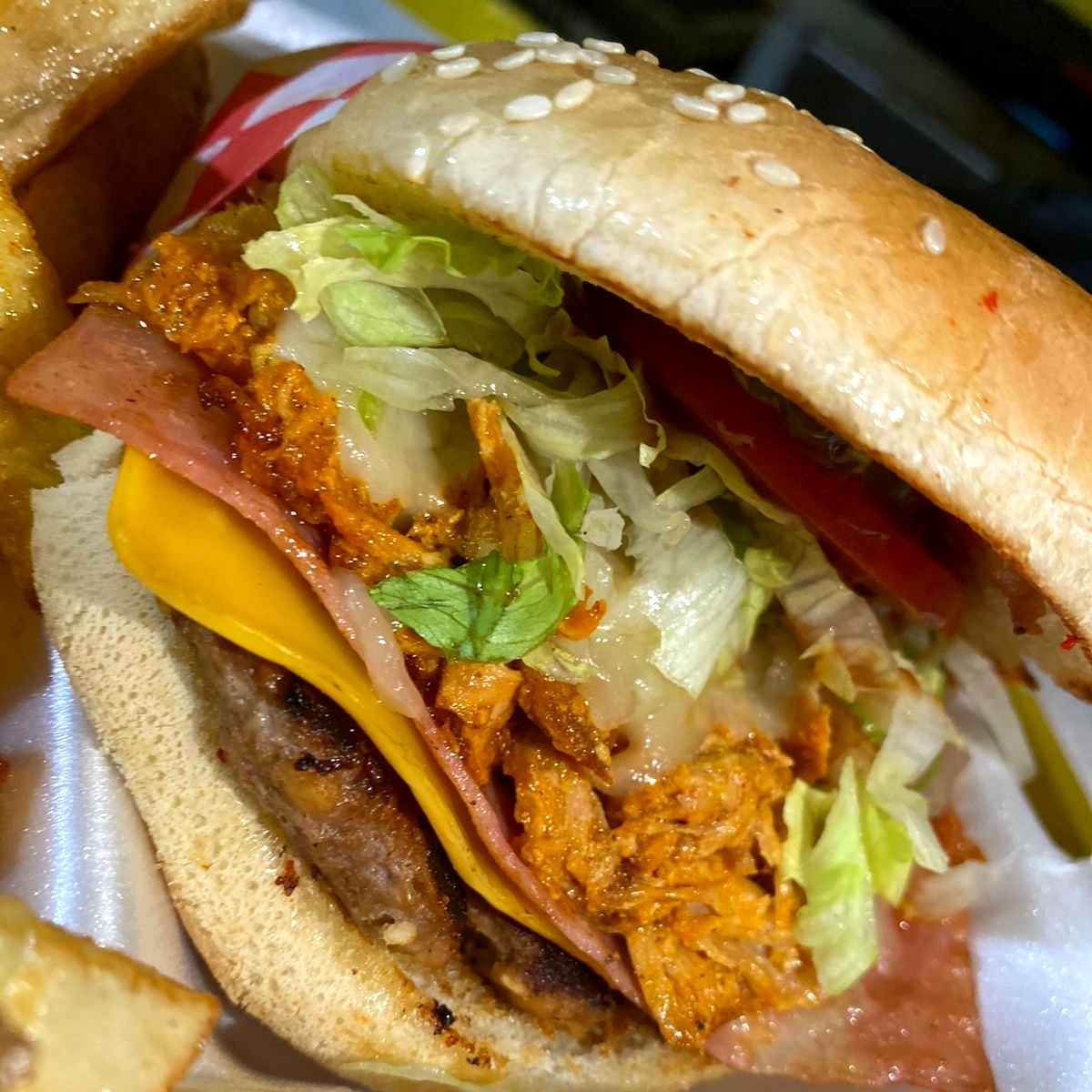 Pan, mayonesa,carne casera,queso Monterrey, queso amarillo,tocino,bbq,capsu,lechuga,tomate,cebolla y moztaza