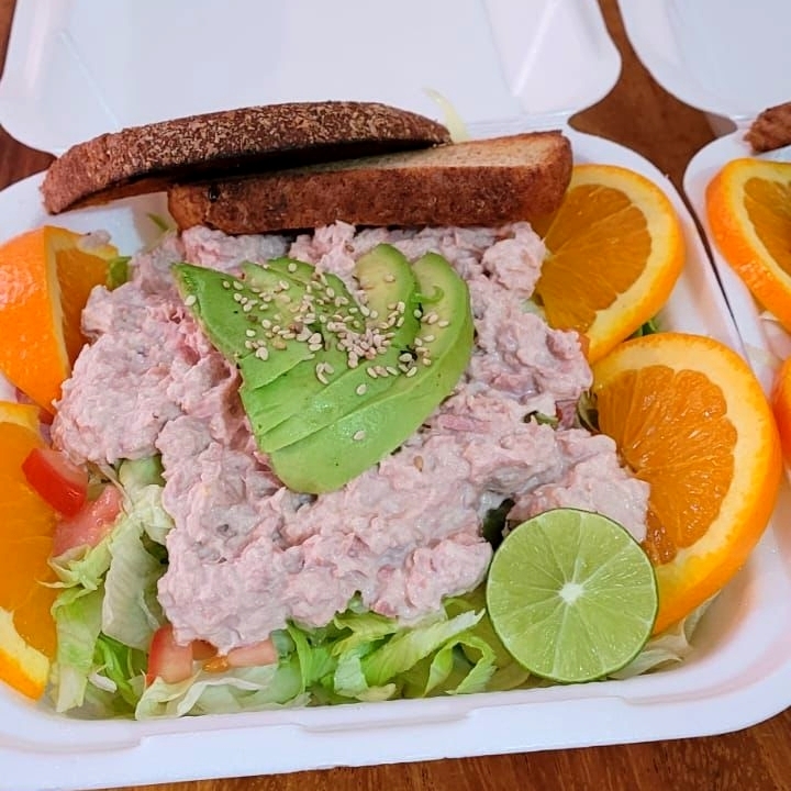 Cama de lechuga,naranja,pechuga,atun preparado una rebanada pan integral
