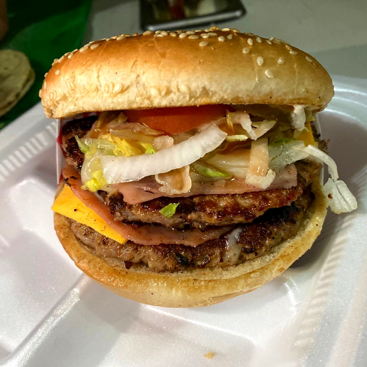 Triple carne casera, tocino, jamón, queso amarillo y queso blanco