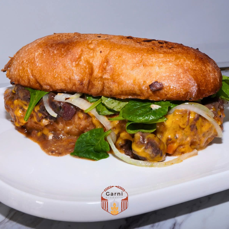 Guiso de carne, cebollas asadas, ajos rostizados con mayonesa, queso cheddar, arúgula y espinacas baby. Pan: pagnotta.
