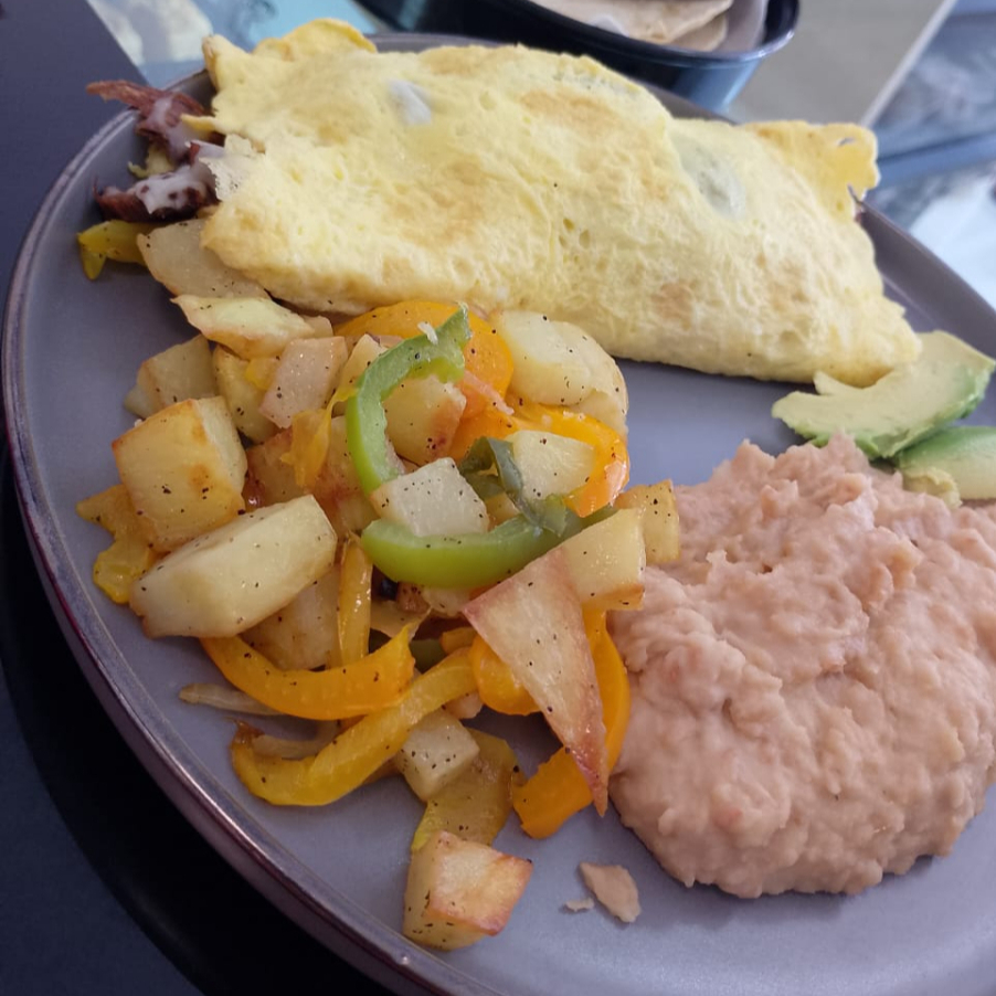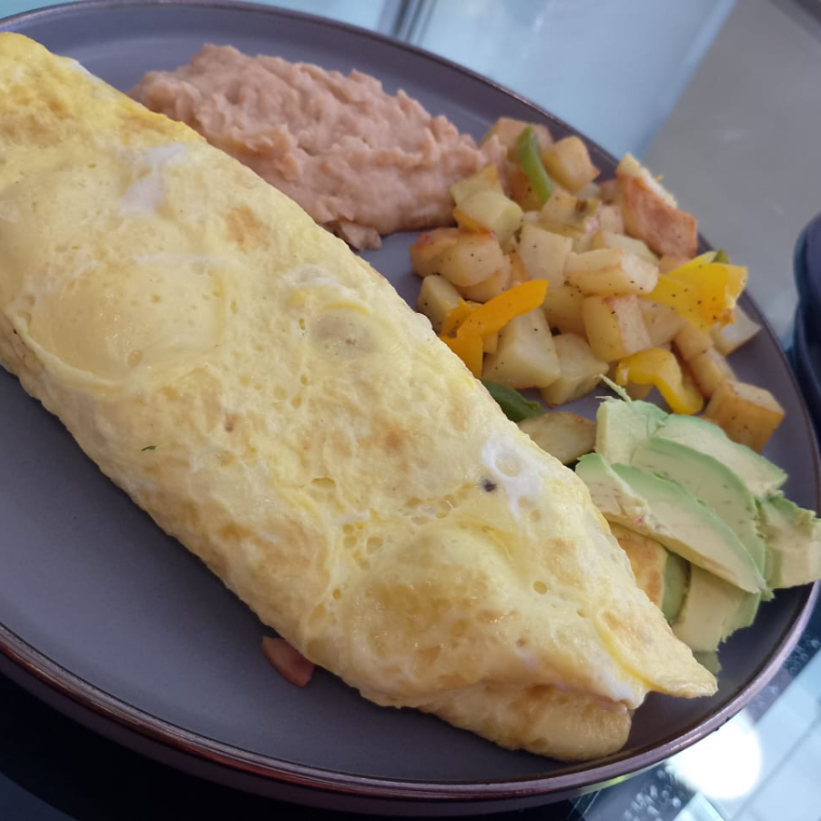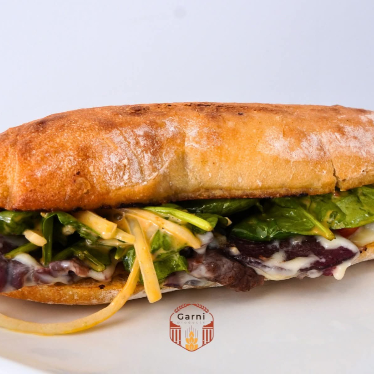 Filete, cebolla, tocino, queso blanco, aderezo de mostaza y horseradish, tomate, aguacate machacado con menta, arúgula, brotes de alfalfa o betabel o brócoli. Pan: pan de cebolla.
