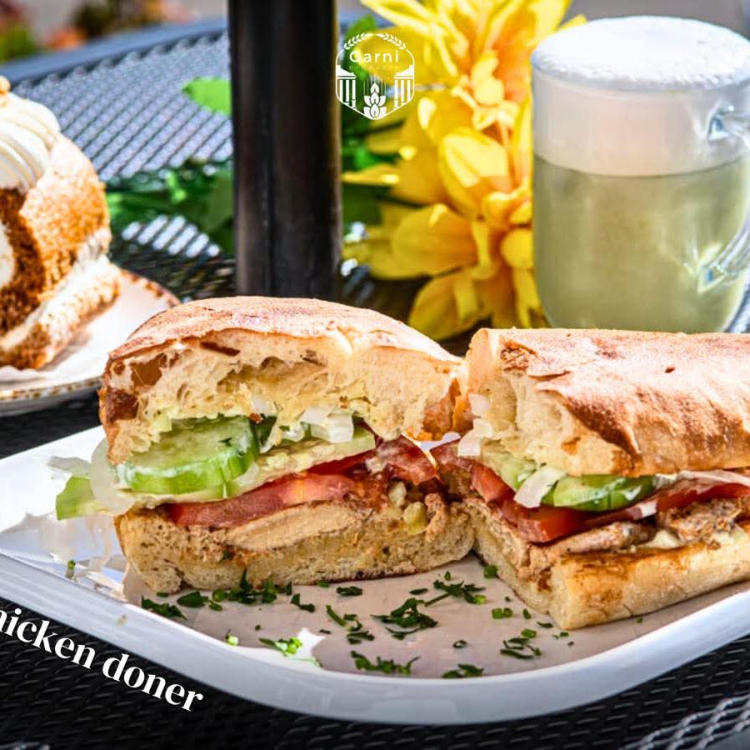 Pollo asado, salsa de yogurt, rodajas de pepino, tomate, cebolla. Pan: puri.