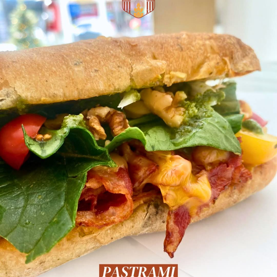Pastrami, mostaza dijon, mayonesa, queso amarillo, espinacas baby, brotes de brócoli o betabel o alfalfa, tomate cherry, cebolla, pesto, nueces picadas. Pan: de aceituna.