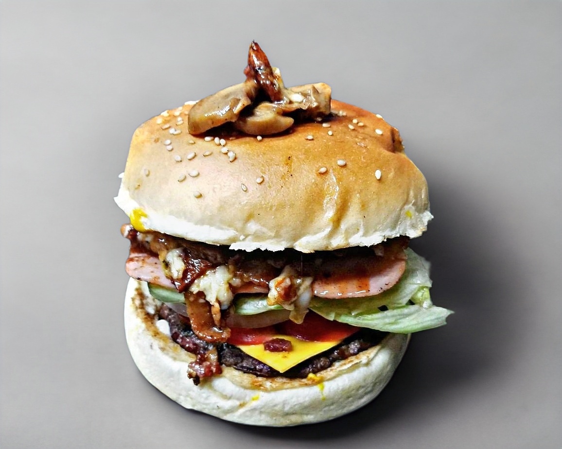 Carne 100% de res, champiñones con BBQ,tocino, queso monterrey y lechuga, tomate, cebolla, jamón, queso amarillo, mayonesa, cátsup y mostaza