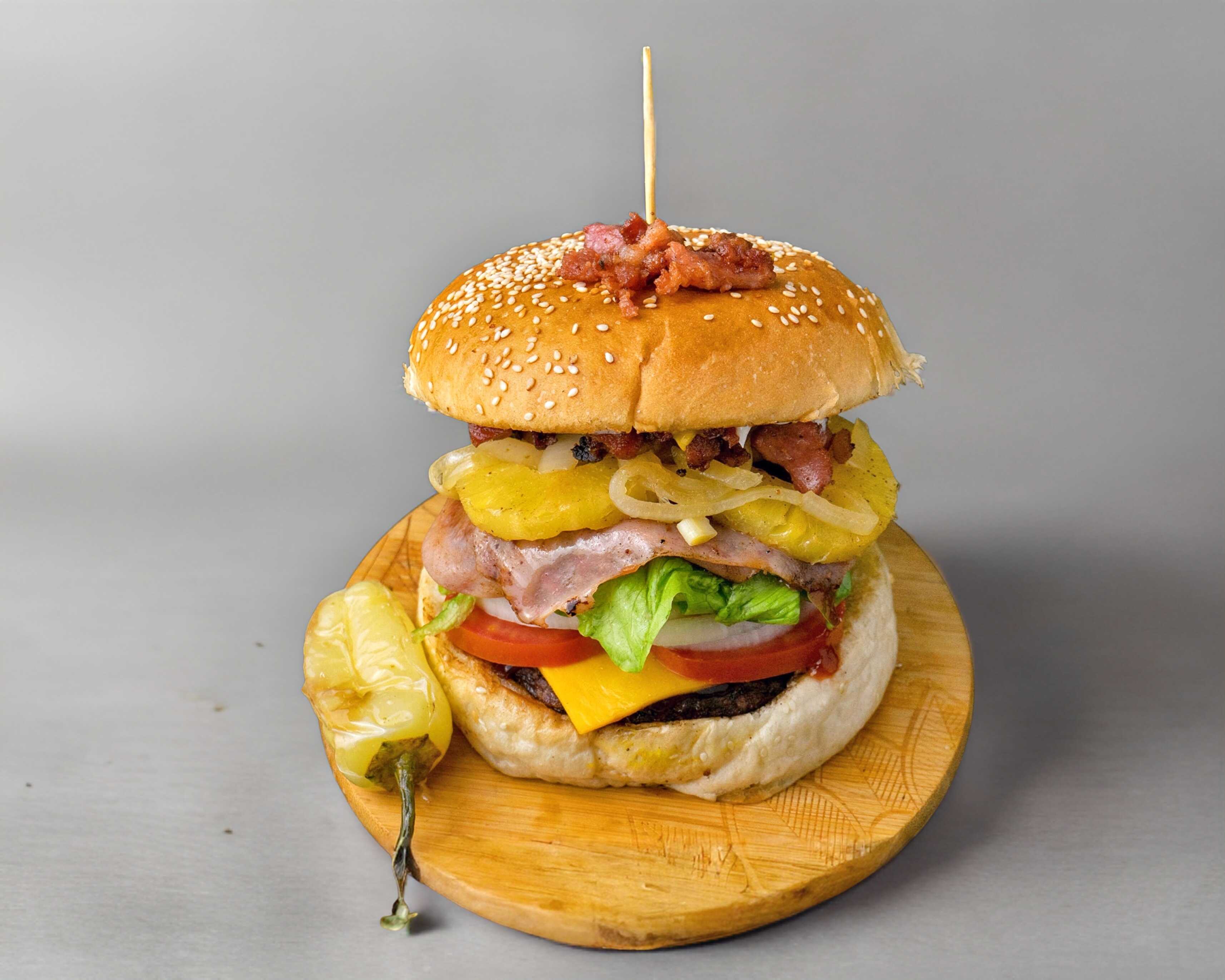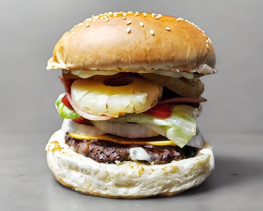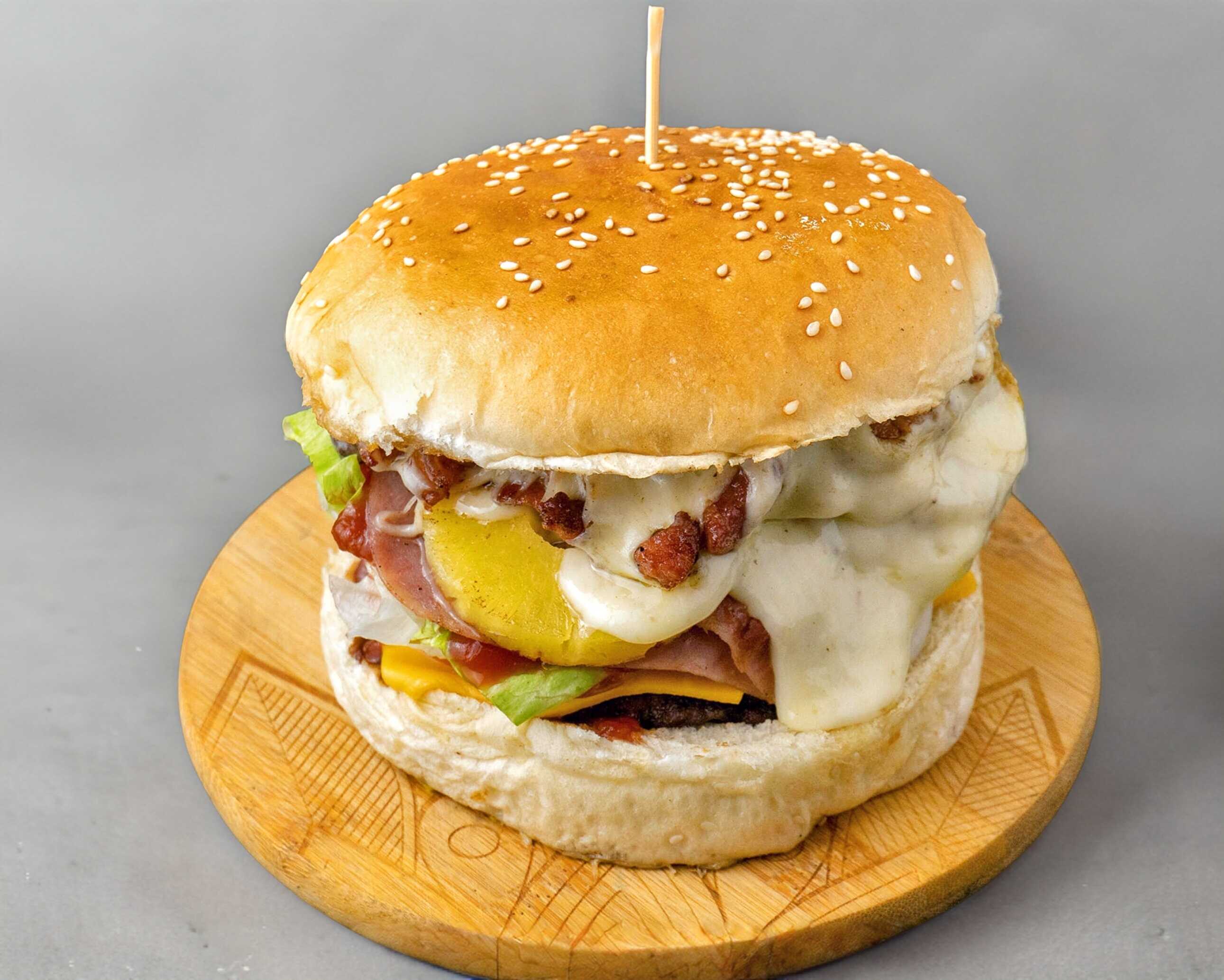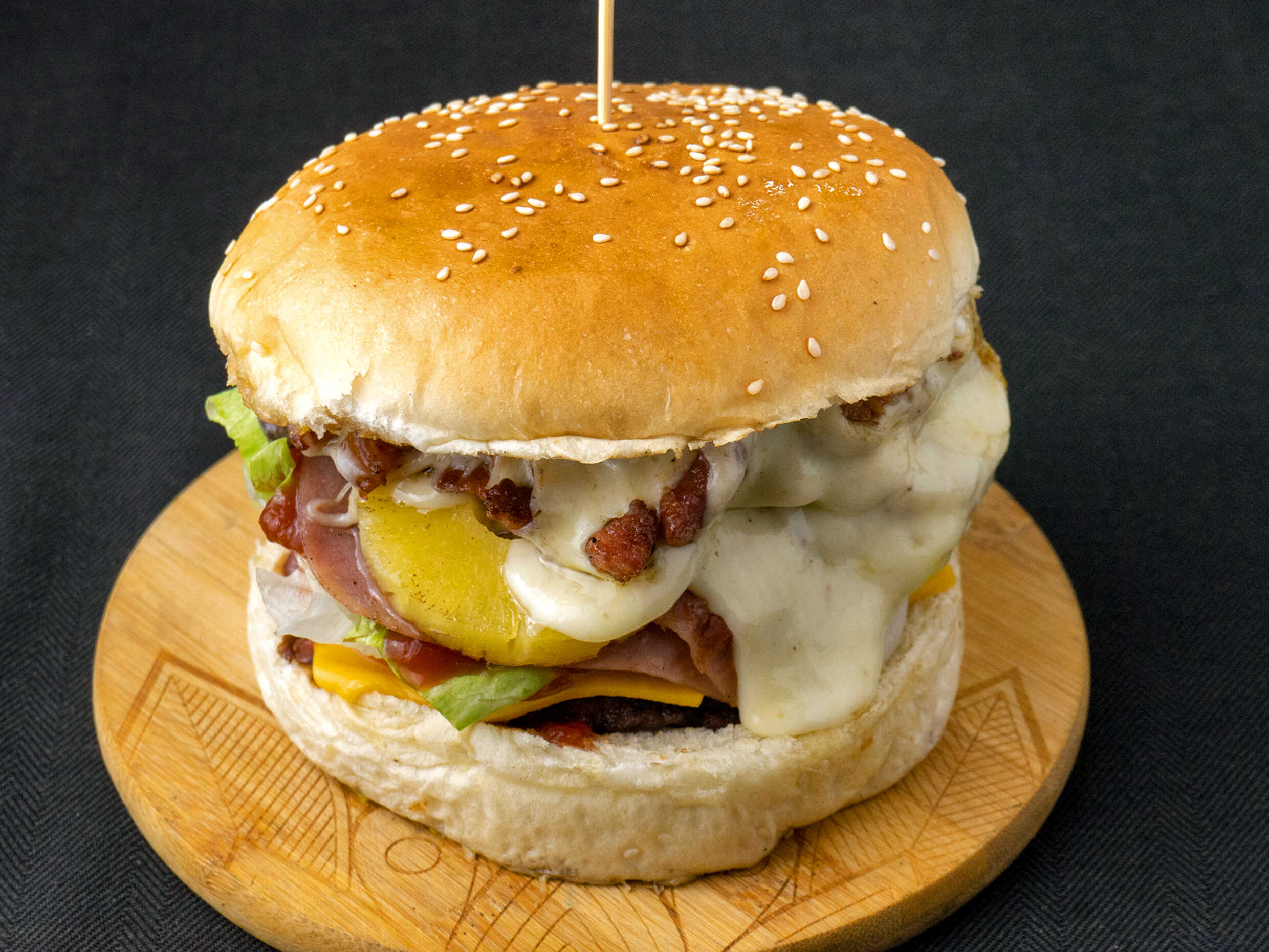 Carne 100% de res, piña, tocino, queso monterrey y lechuga, tomate, cebolla, jamón, queso amarillo, mayonesa, cátsup y mostaza