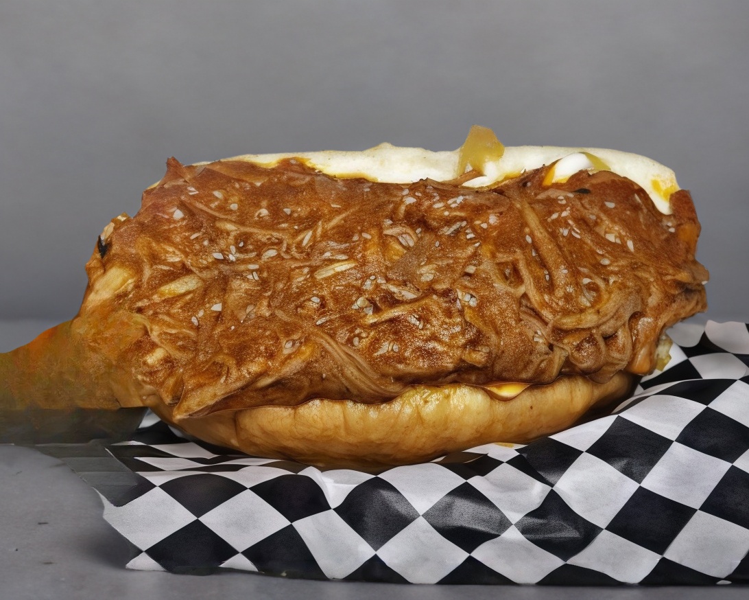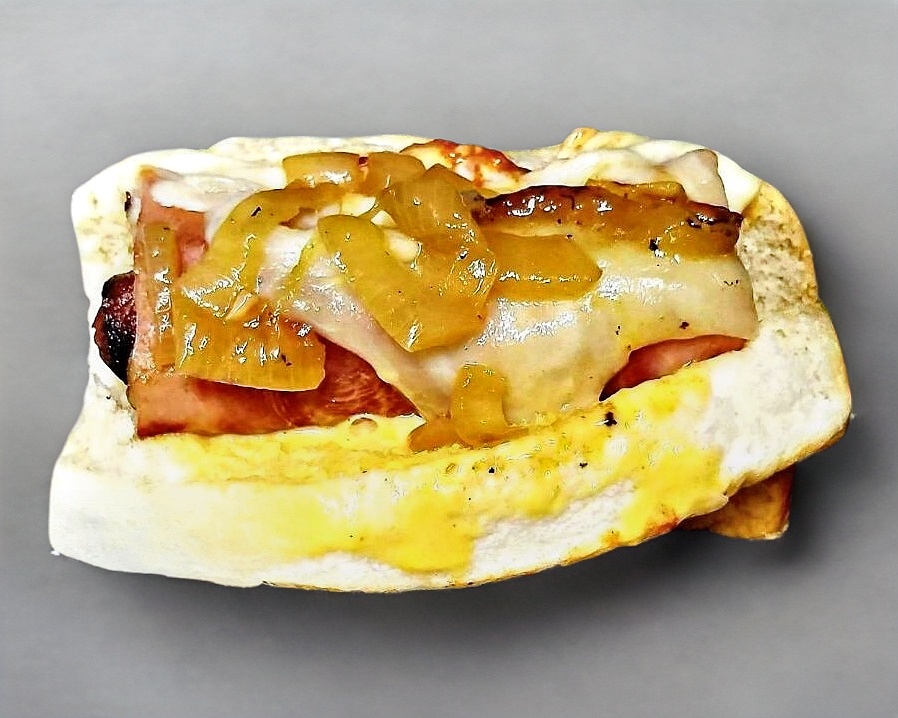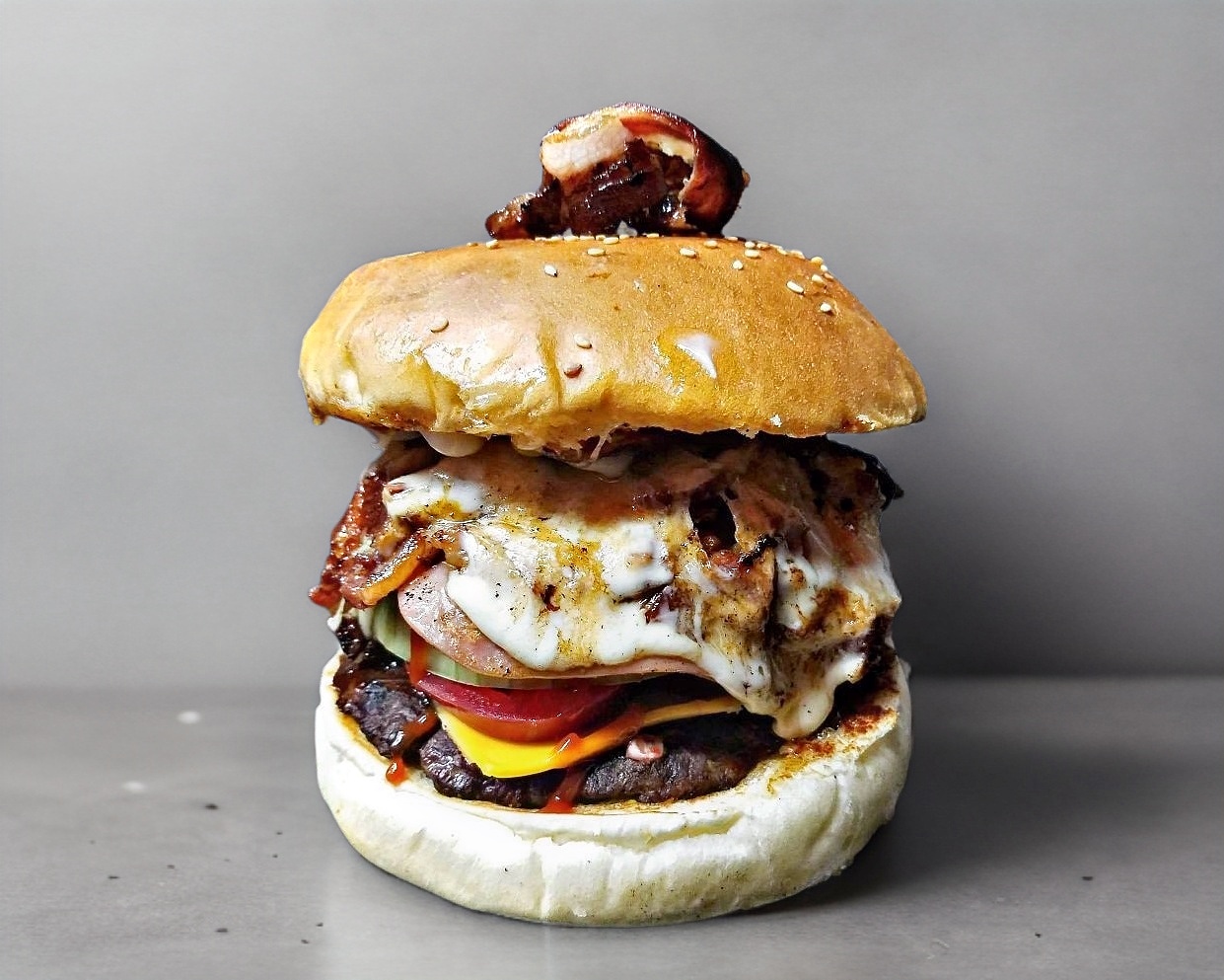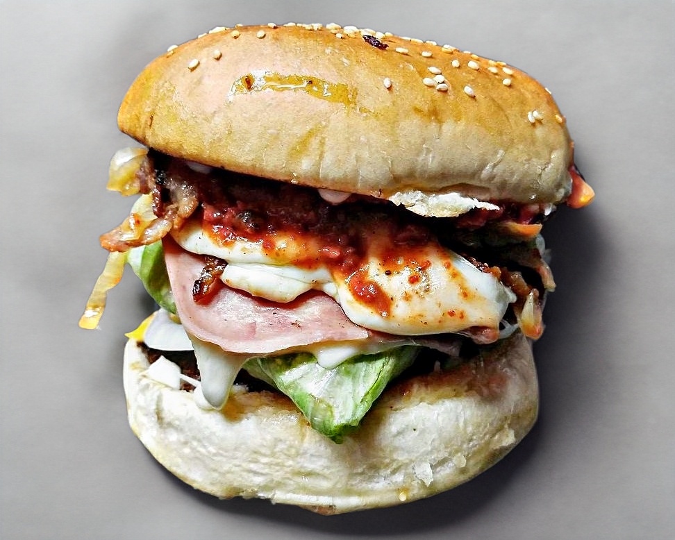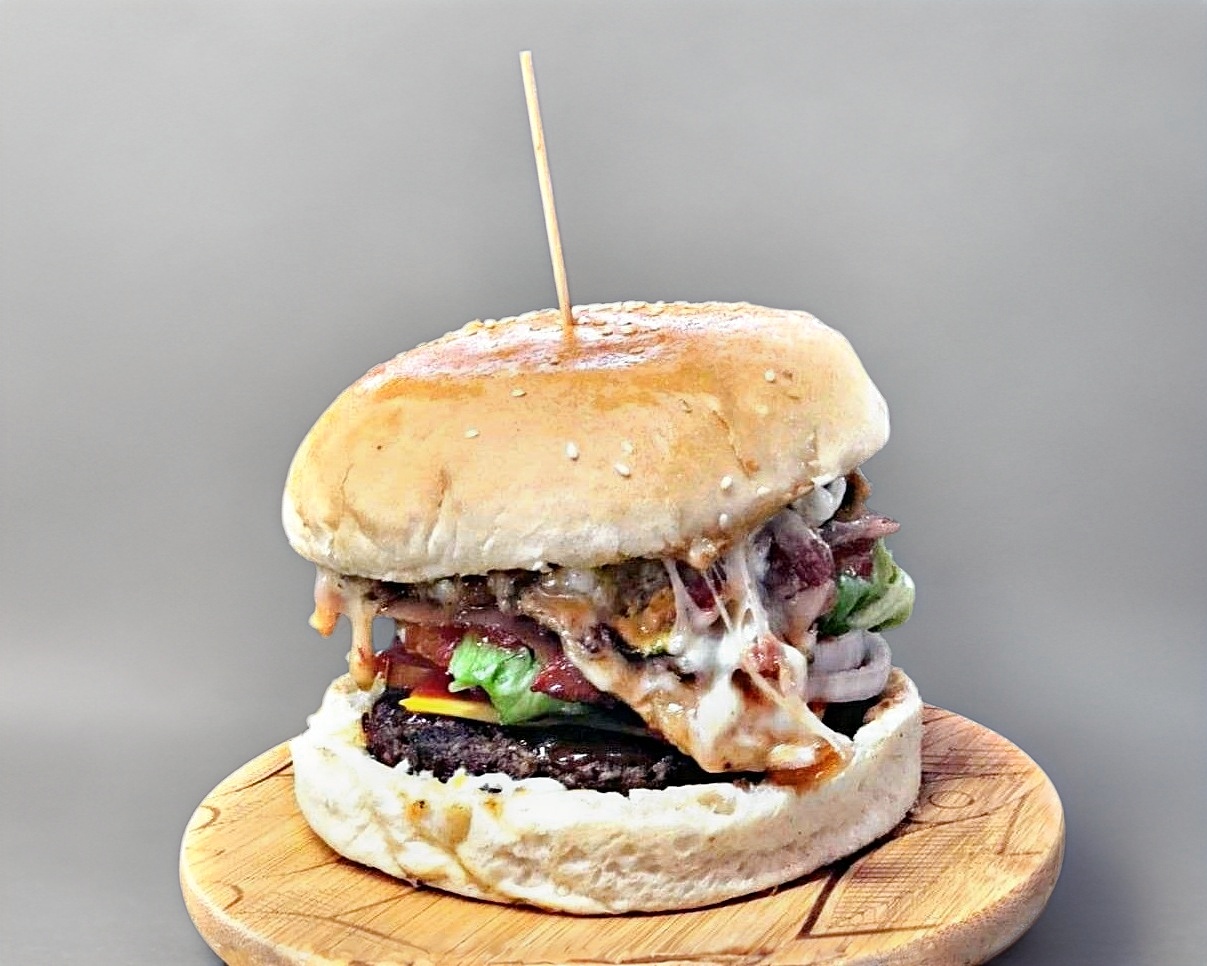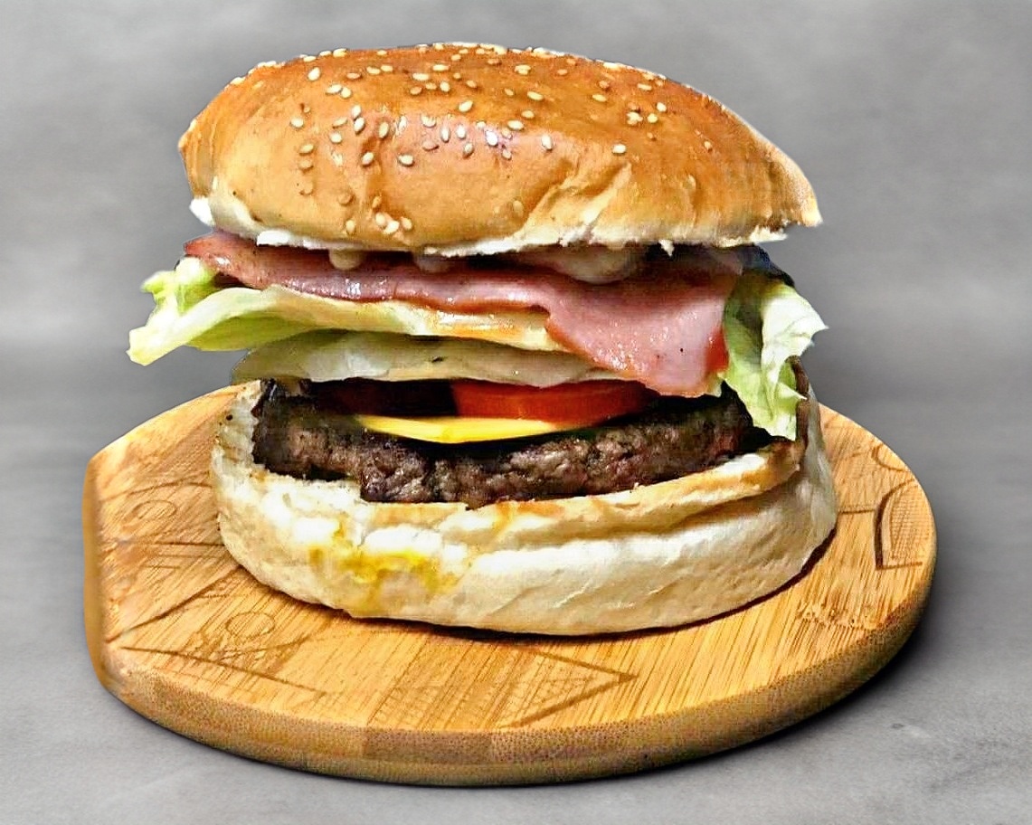 Carne 100% de res, tocino y queso monterrey lechuga, tomate, cebolla, jamón, queso amarillo, mayonesa, cátsup y mostaza