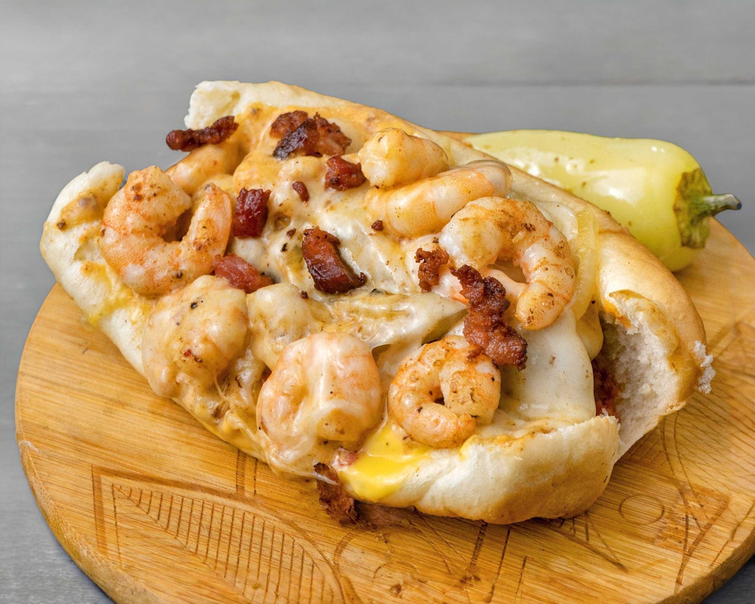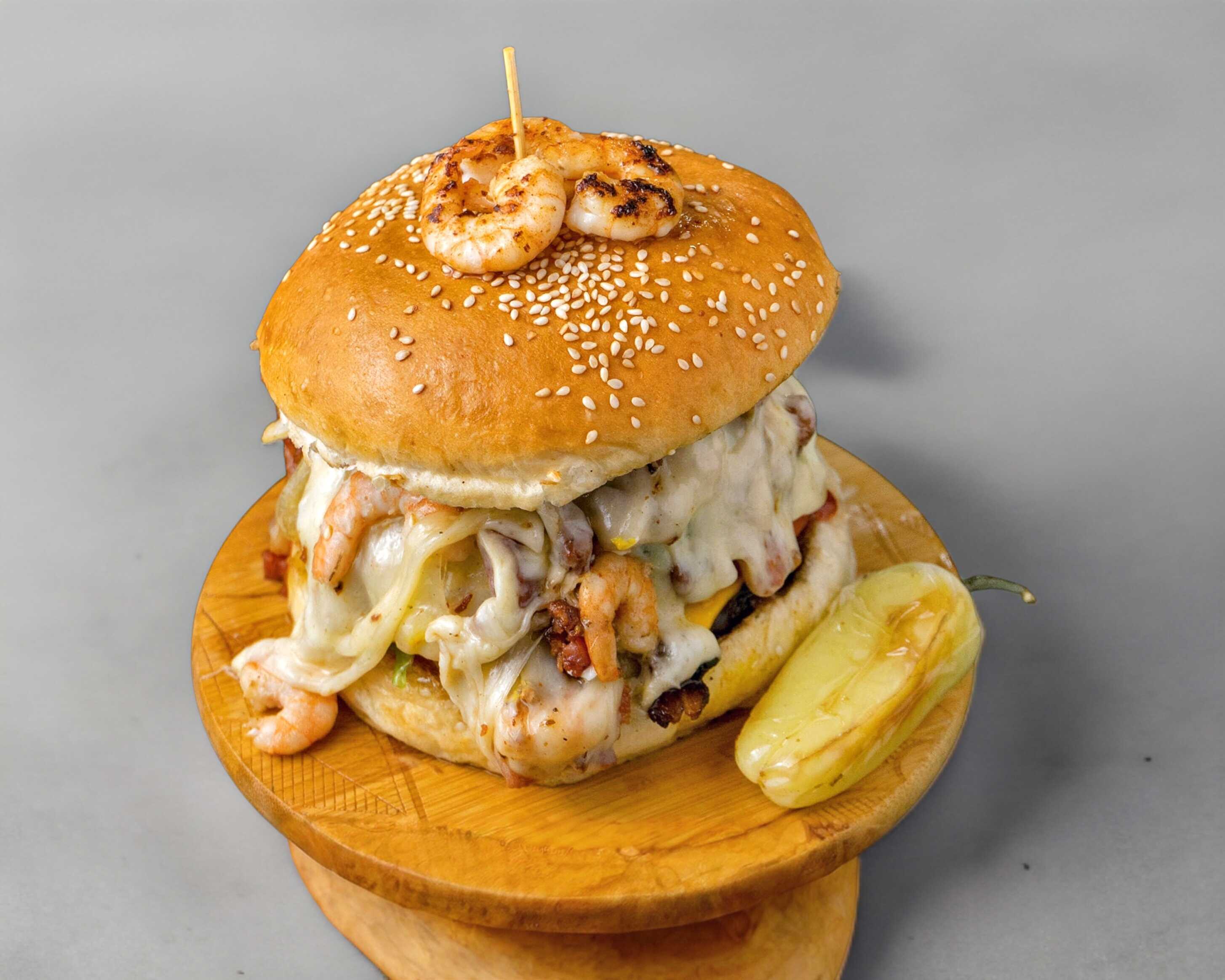 Carne 100% de res, Camarón con aderezo de chipotle, tocino, queso monterrey y lechuga, tomate, cebolla, jamón, queso amarillo, mayonesa, cátsup y mostaza