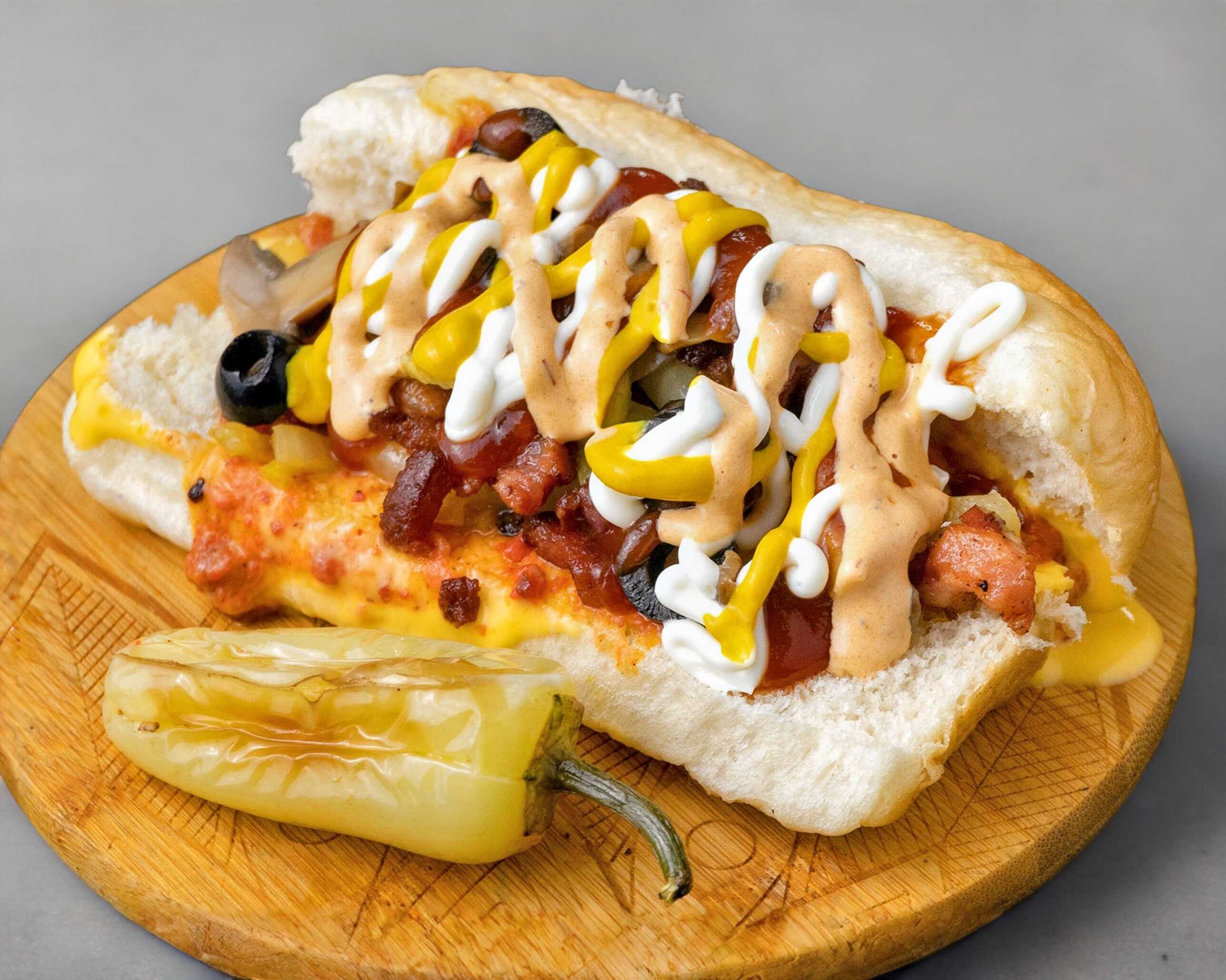 Salchicha envuelta en jamón con queso monterrey y tocino, queso monterrey, queso amarillo, cebolla asada, frijol con chorizo, tomate, cebolla, pepinillo, aceituna negra, piña, queso seco, champiñón, ruffles, chiles jalapeños, zanahoria, aderezo de chipotle, cátsup, mayonesa y mostaza