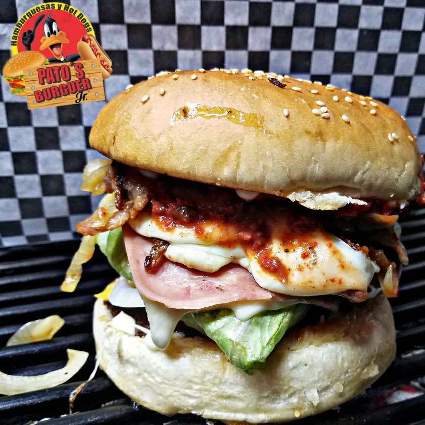 Carne 100% de res, lechuga, tomate, cebolla, jamón, queso amarillo, mayonesa, cátsup y mostaza