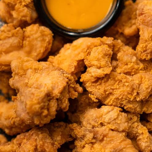 CAMA DE PAPAS FRITAS CON TENDERS DE POLLO BAÑADOS EN SALSA BUFALO O BBQ, CREMA Y CEBOLLIN