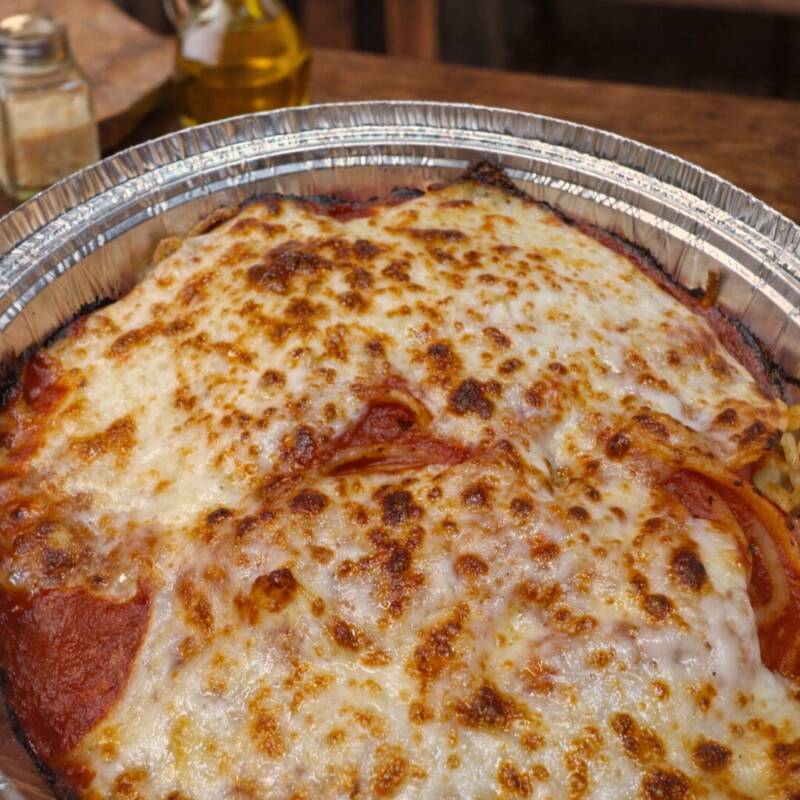 CON QUESO MOZZARELLA GRATINADO, SALSA ITALIANA Y QUESO PARMESANO.