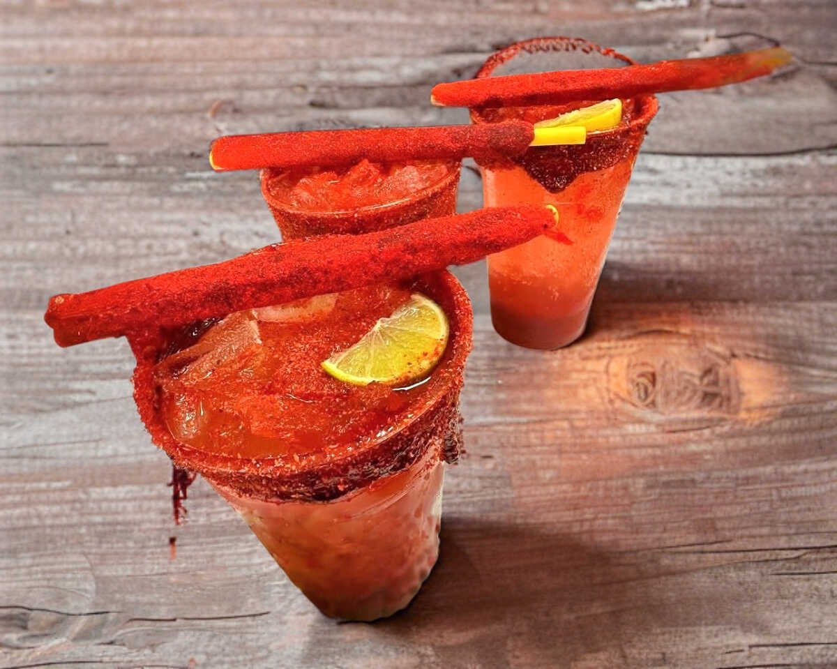 Clamato, sal, apio en polvo, salsa tabasco, salsa inglesa, soya, limón, tajín, hielo, saladito, banderilla de tamarindo. (24 onz)
