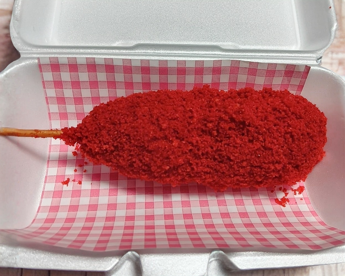 Banderilla coreana rellena de queso y salchicha , empanizadas de panko coreano y chetos Fleming hot.