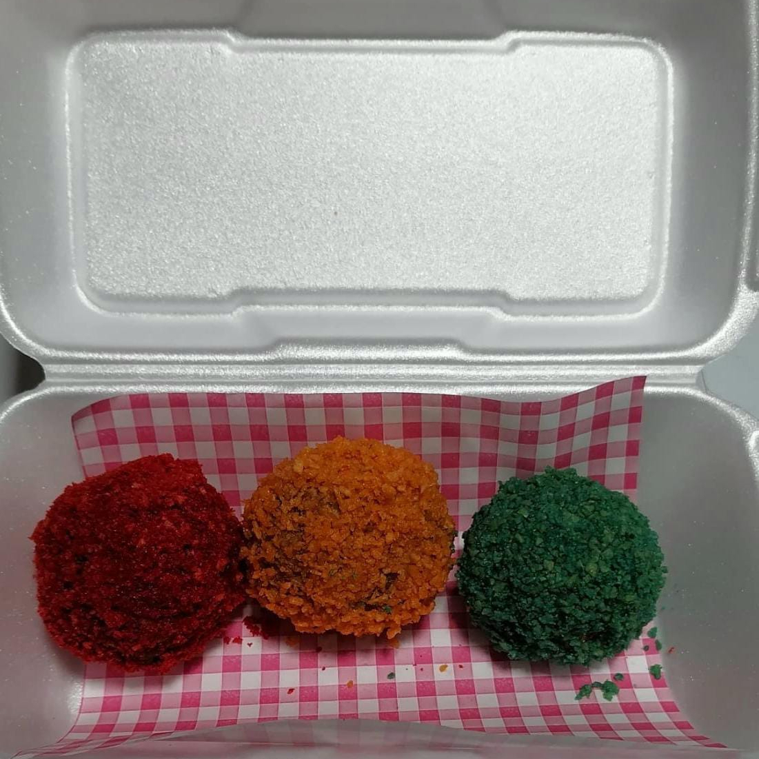 Son tres bombitas o bites, son bolitas de masa de banderiila coreanas rellenas de queso, empanizadas con panko coreano y sabritas. Cheetos flaming hot, Ruffles queso y Takis blue.