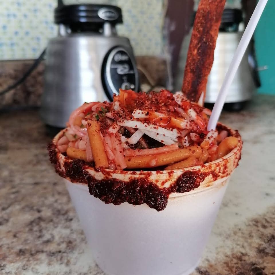 churros, cacahuates, jicama, pepino, cueritos, rielito, salsa botanera, chamoy, limón, clamato, banderilla de tamarindo.