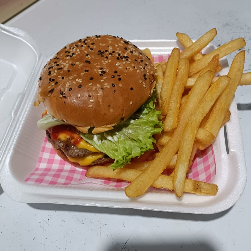 Carne de res, aderezo de la casa ,queso amarillo ,pepinillo, mostaza ,cebolla , lechuga ketchup , acompañado de papas.
