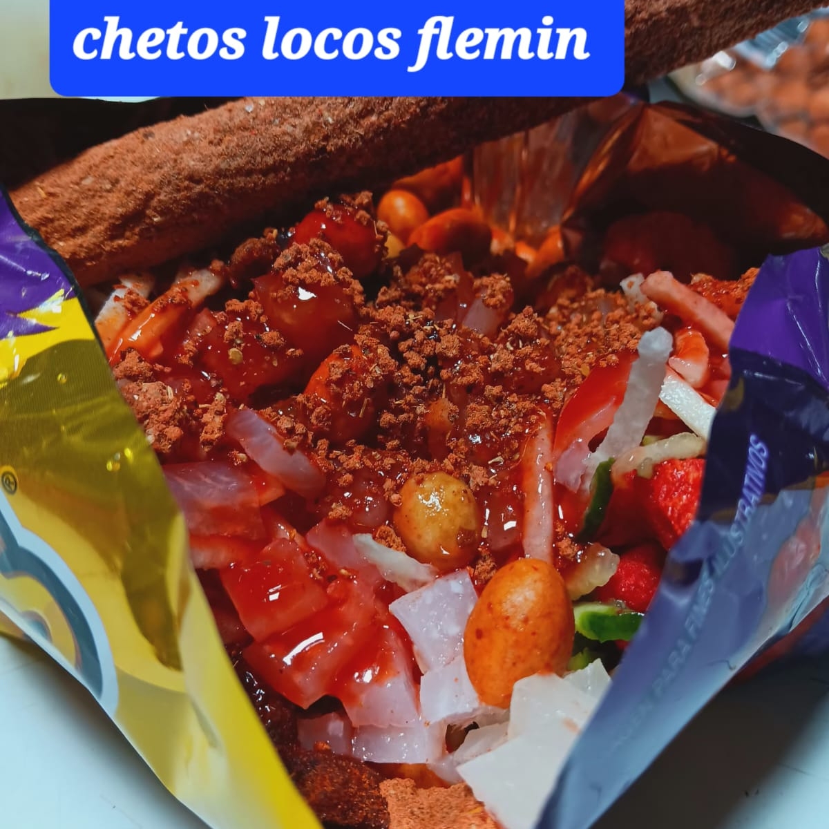 Cheetos flaming hot, cacahuates, jicama, pepino, cueritos, rielito, salsa botanera, chamoy, limón, clamato, banderilla de tamarindo.