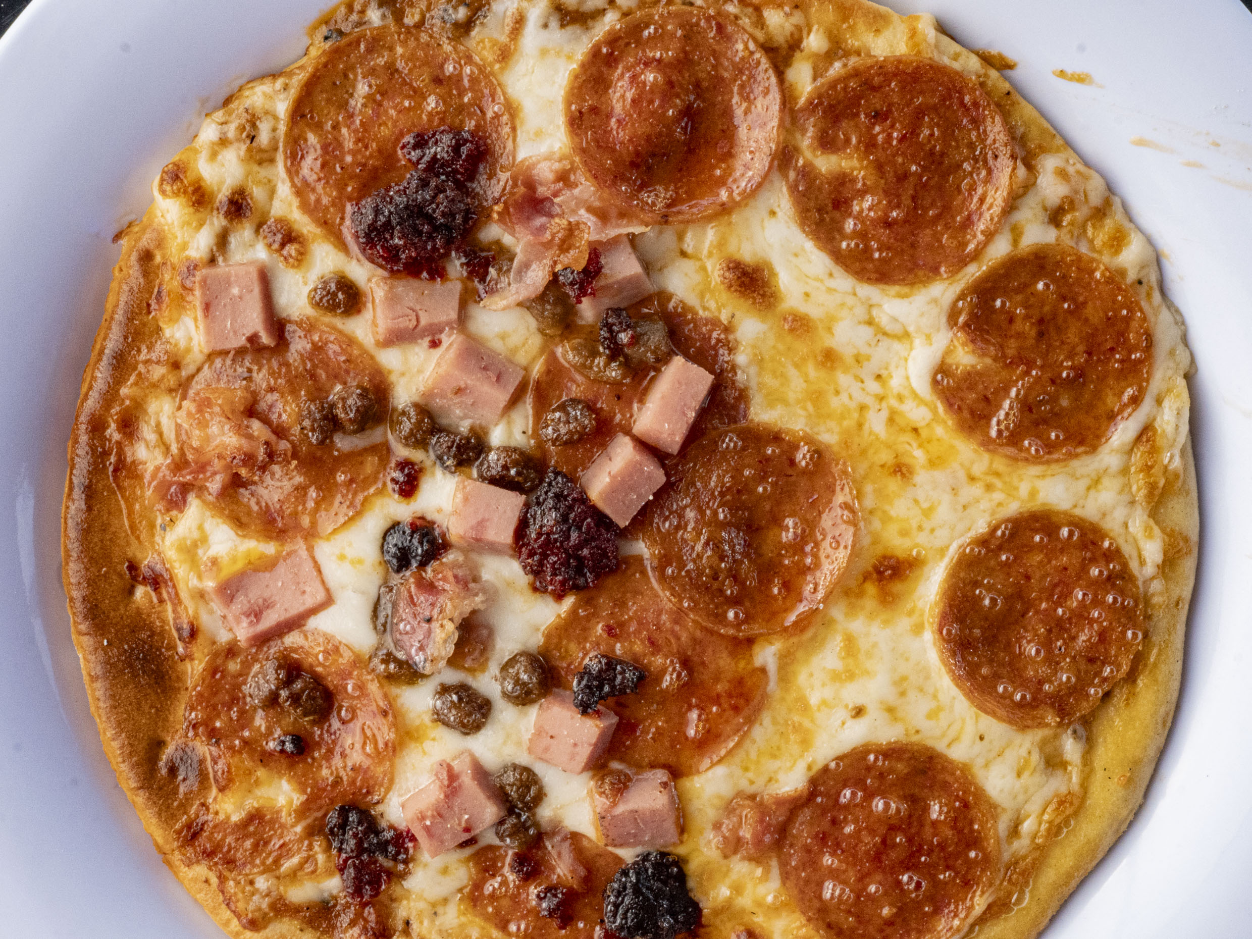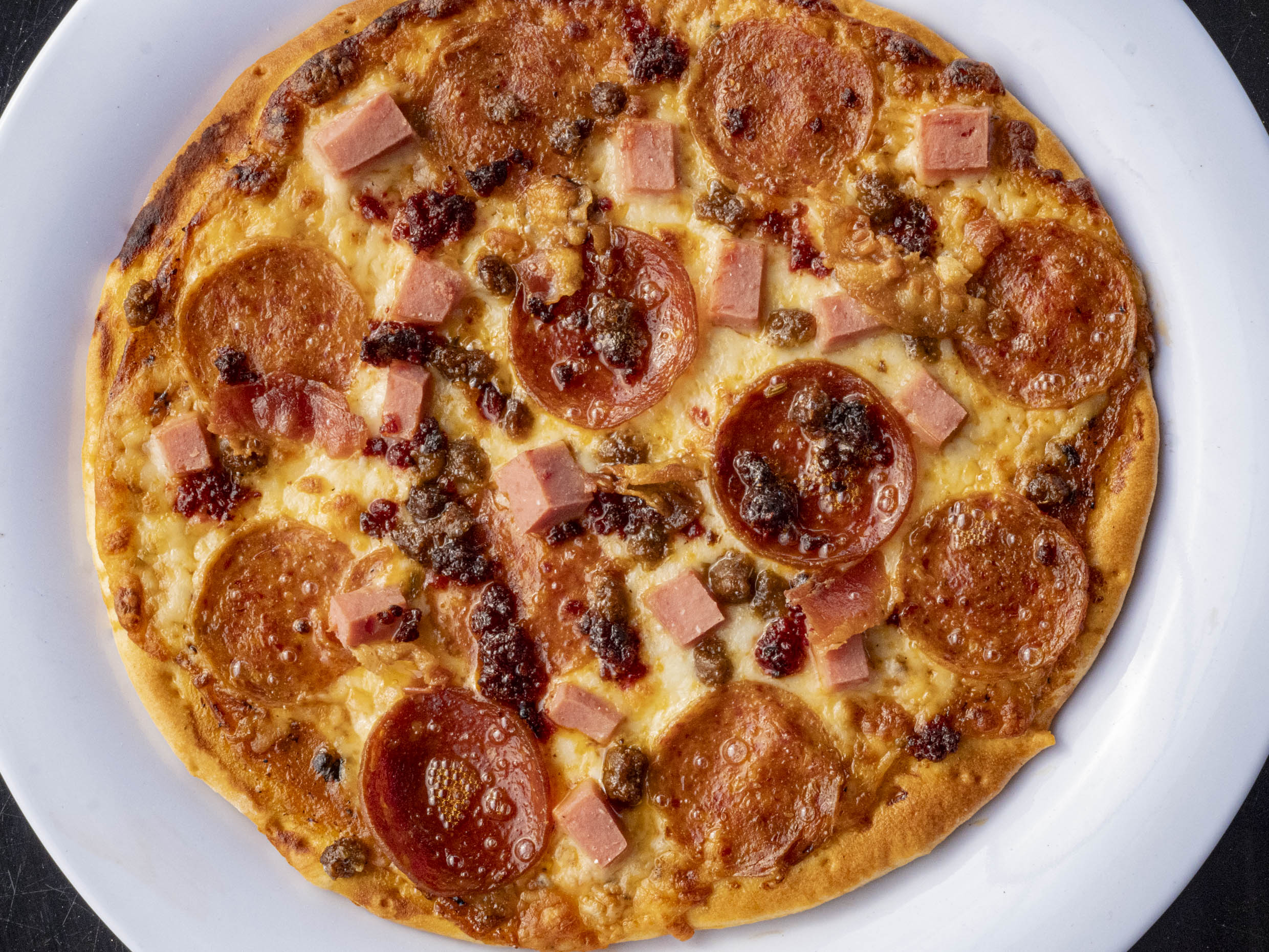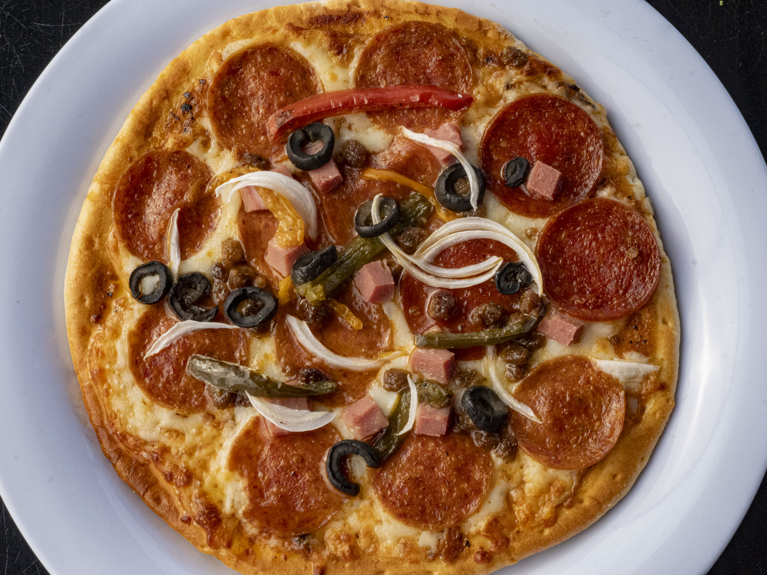 Peperoni, Jamon, Pimientos, Aceituna negra, Salchicha Italiana, Cebolla Blanca