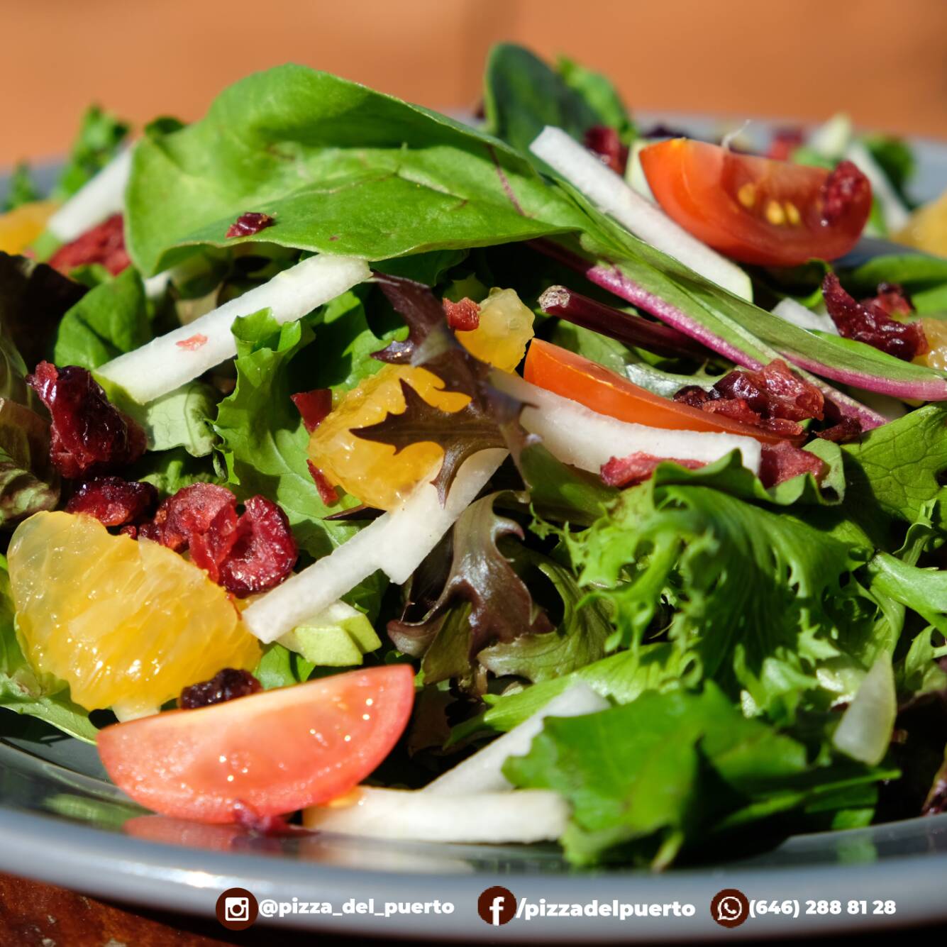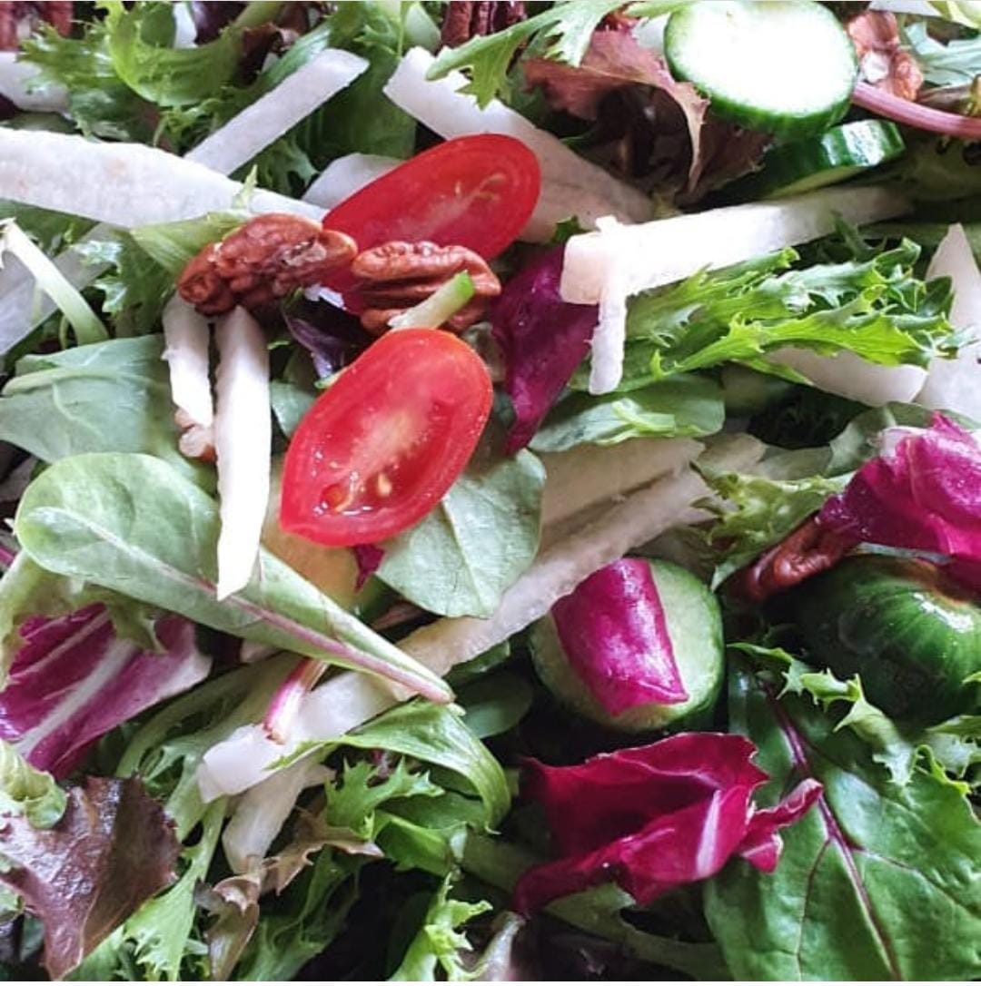 Lechuga mixta orgánica, pepino persa, jicama, tomate cherry, piña y nuez acompañada de una vinagreta de cítricos.