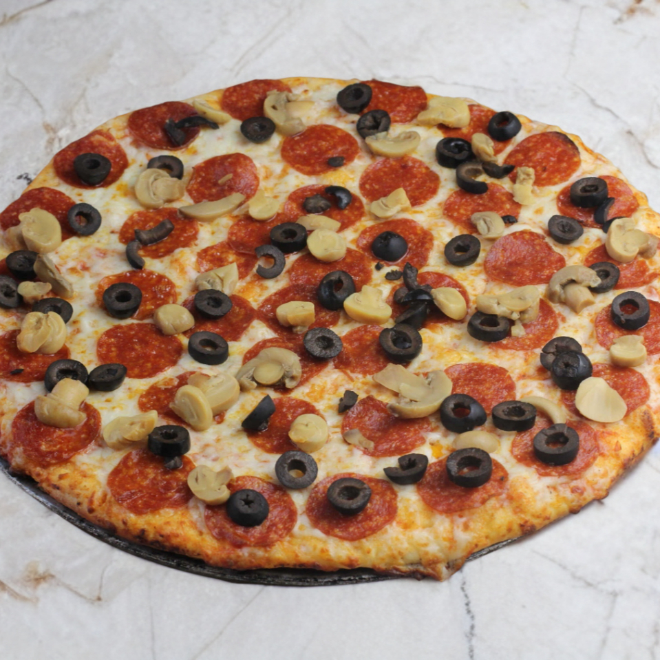 Queso mozzarella, pepperoni, aceituna y champiñón.
