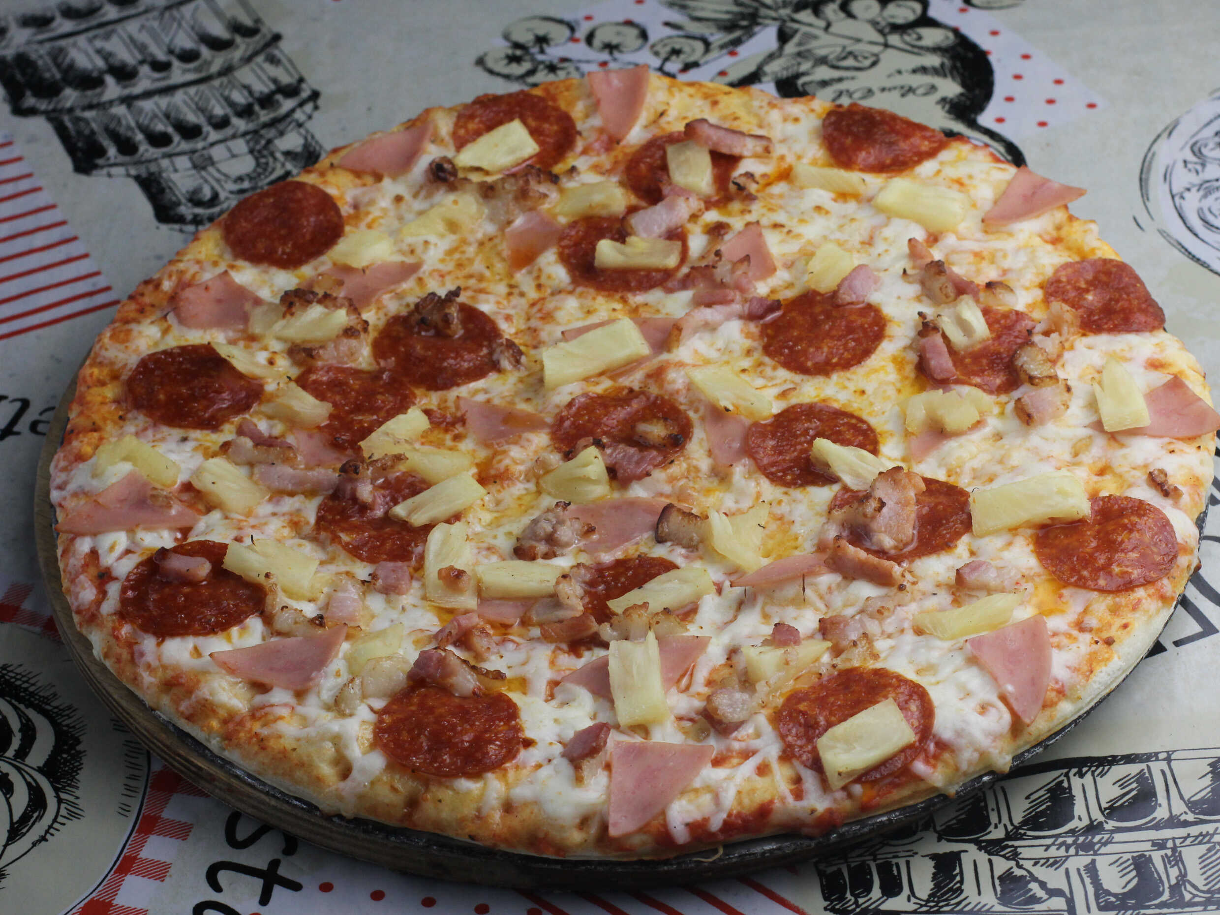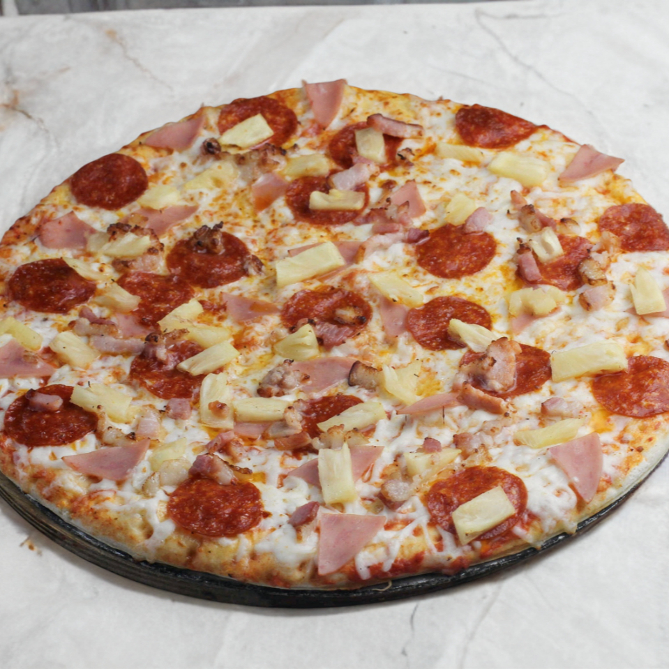Queso mozzarella, pepperoni, jamón, piña y tocino.