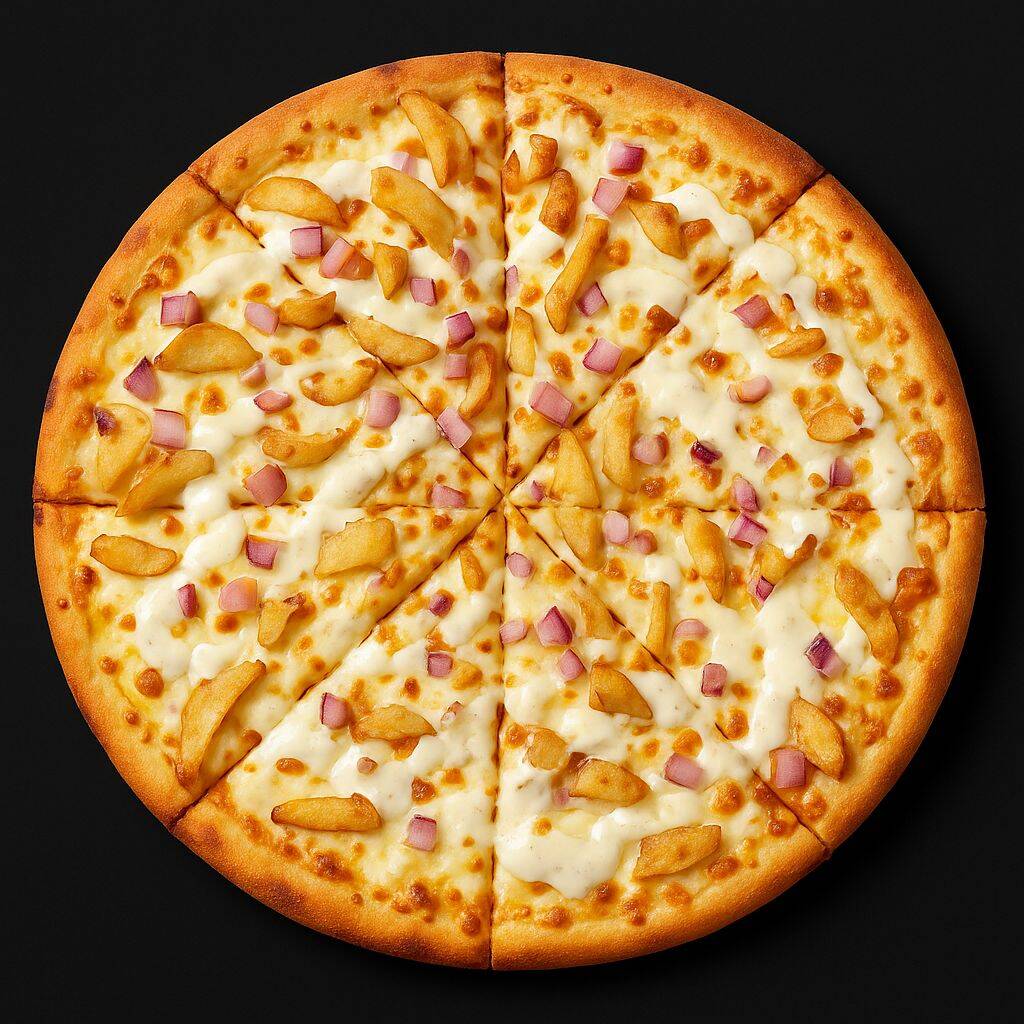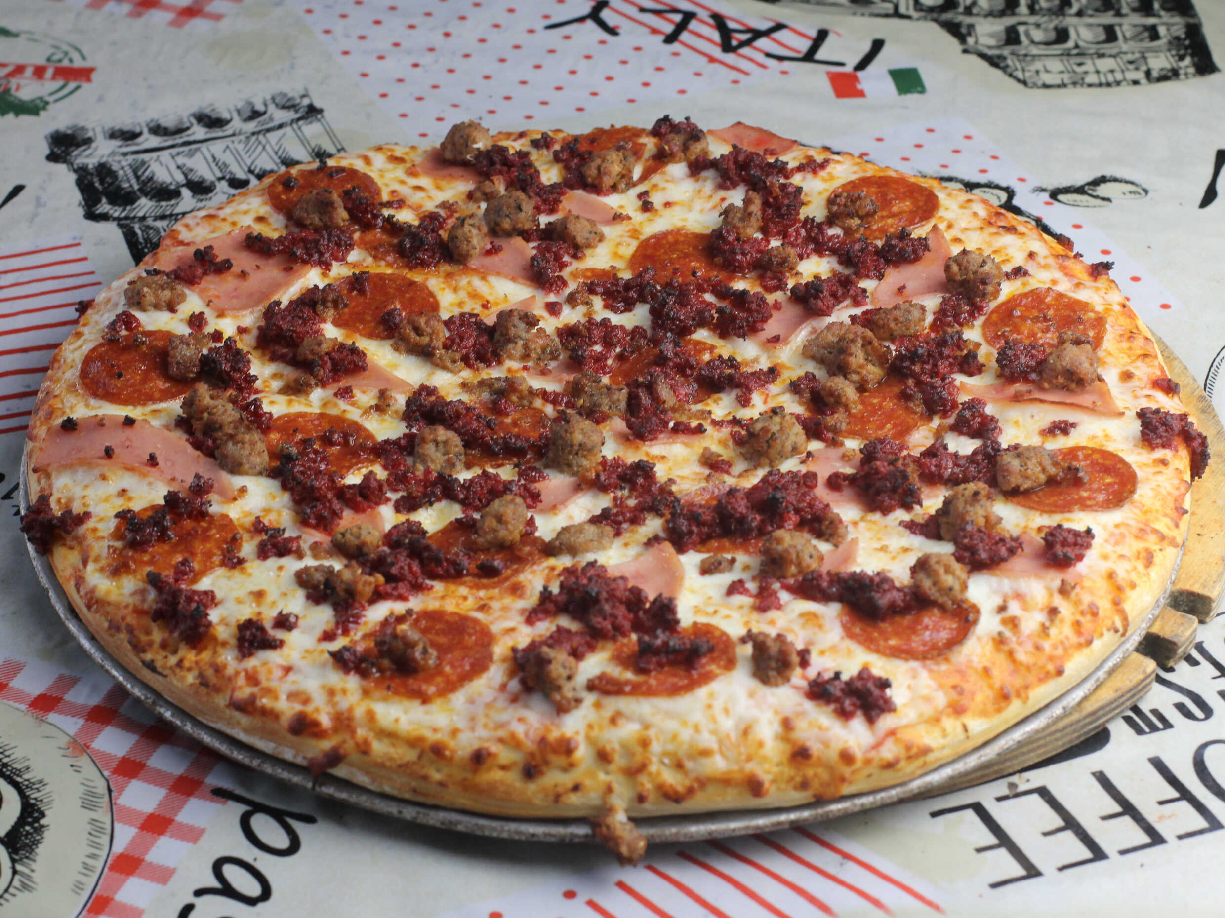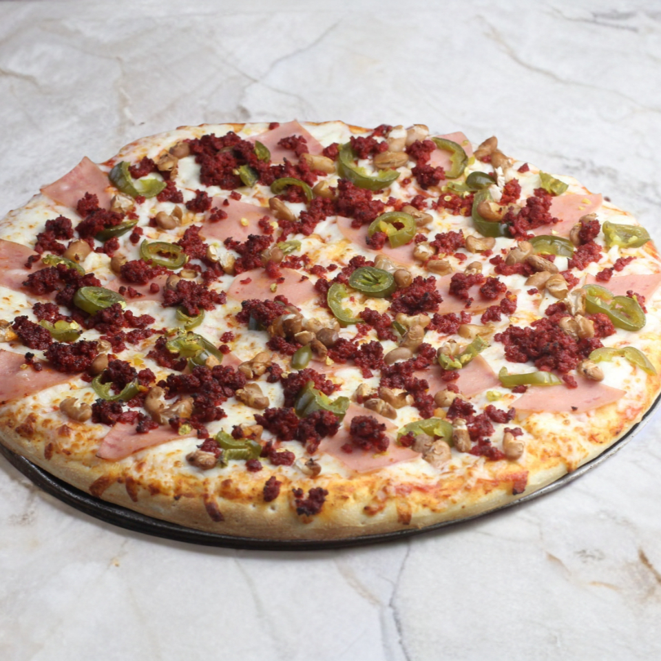 Queso mozzarella salsa de tomate ,peperoni,tocino,jalapeño,cebolla morada