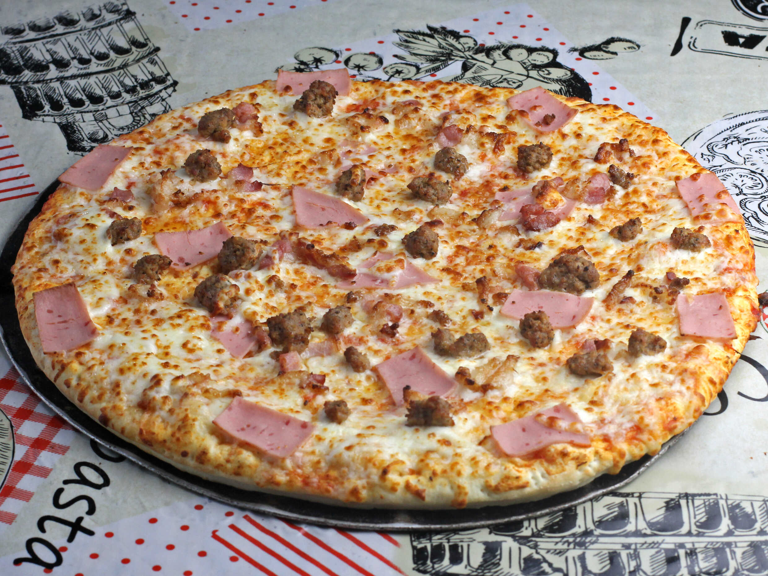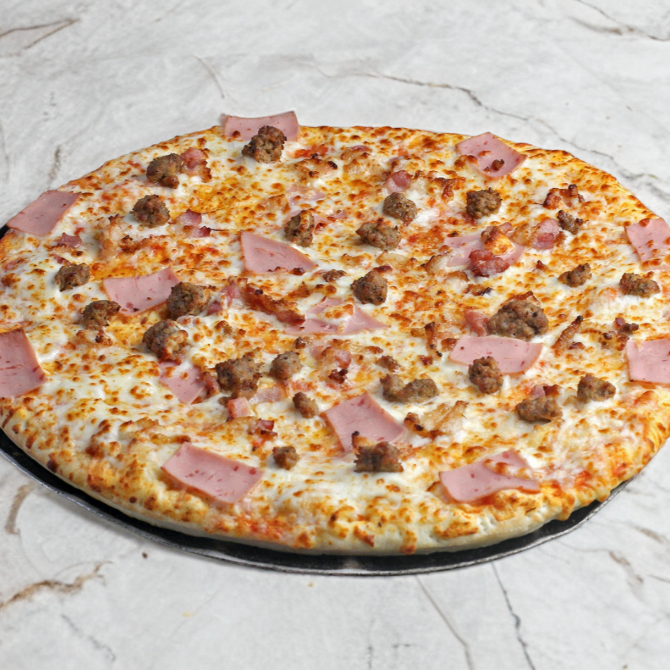 Queso mozzarella, salchicha italiana, jamón y tocino.