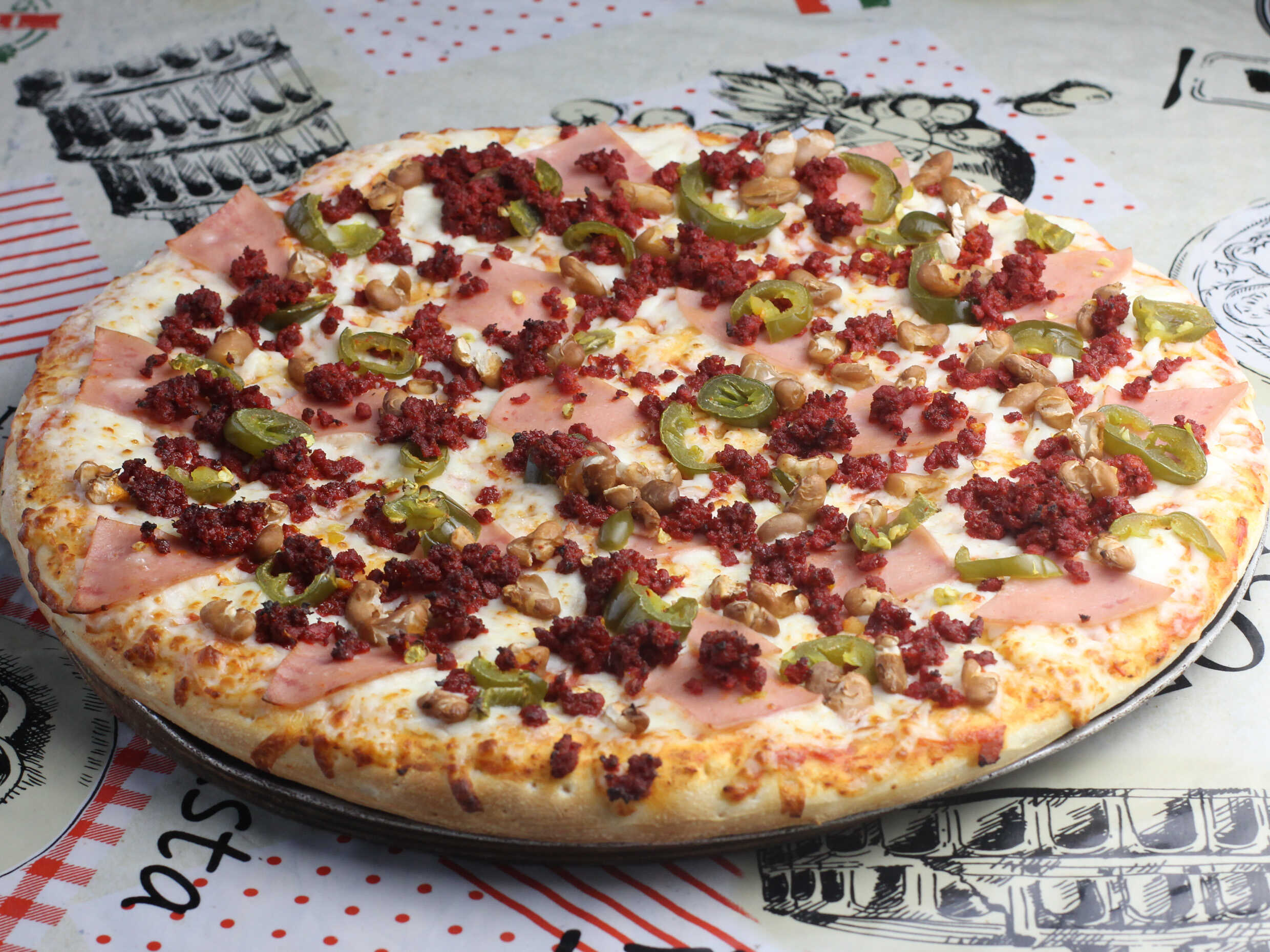 Queso mozzarella y salsa de tomate, jamón, chorizo, tocino, jalapeño