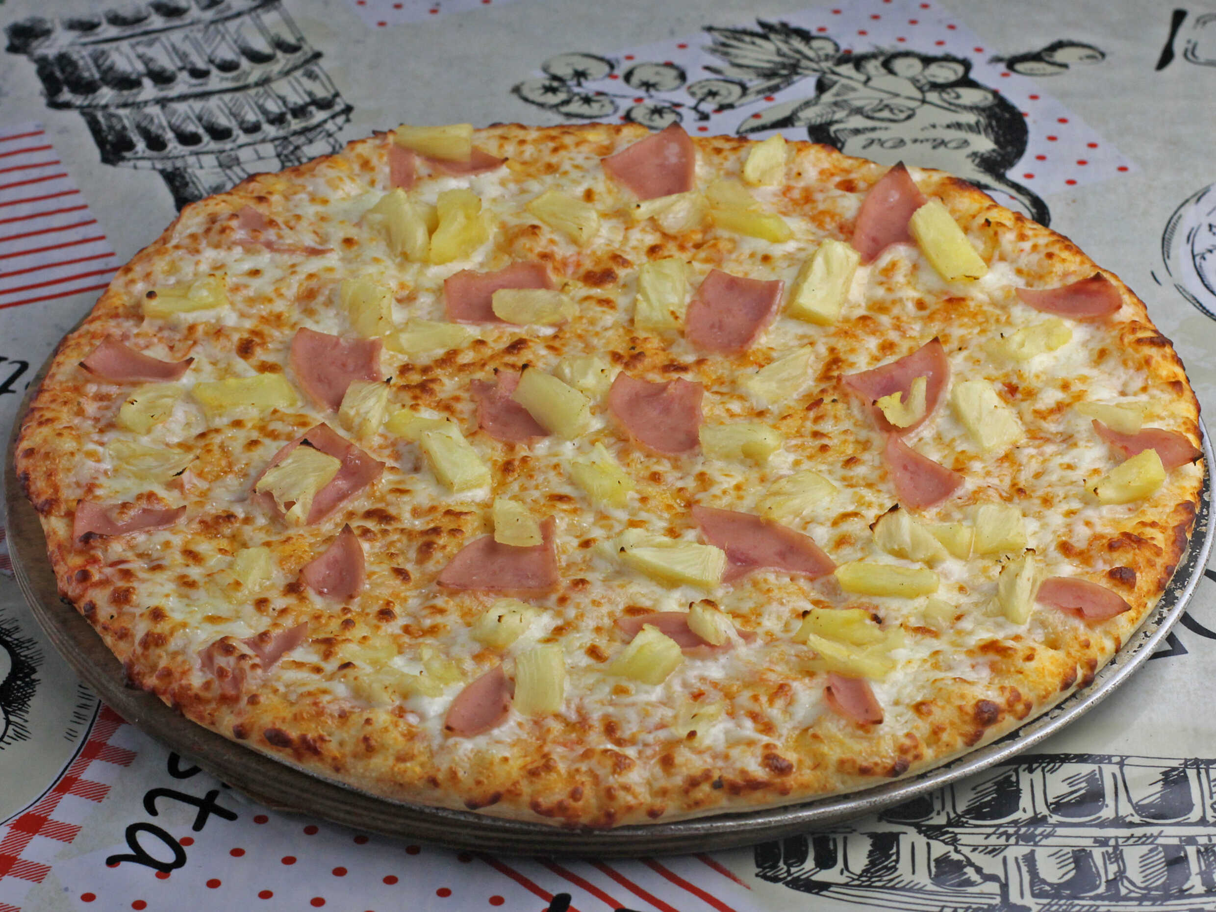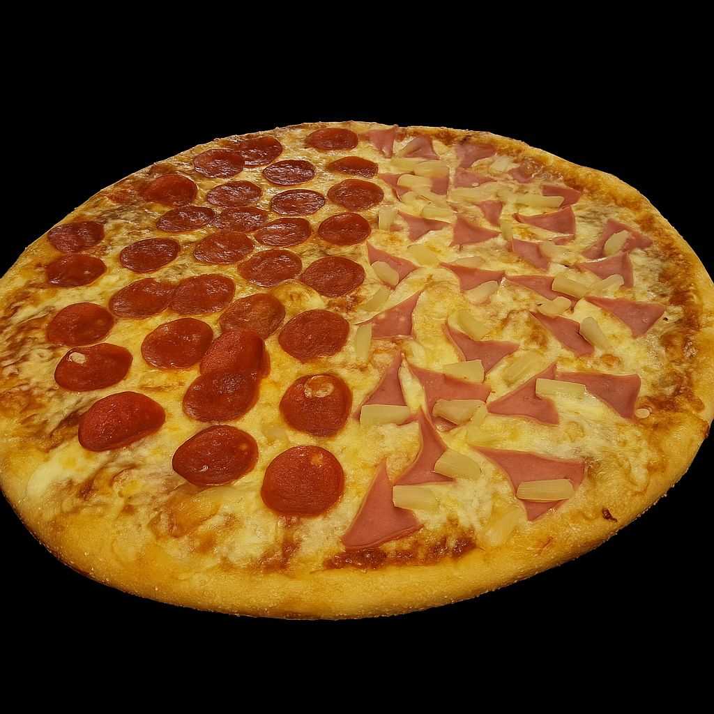 Queso mozzarella salsa de tomate, jamón piña tocino Peperoni