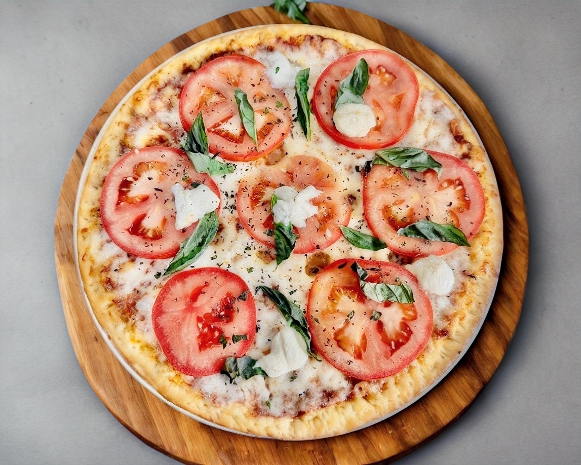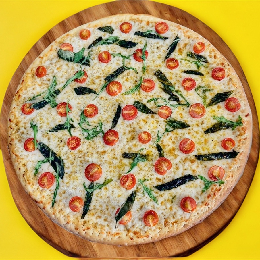 Salsa de tomate, queso, tomate fresco, albahaca fresca, oliva, orégano y burrata.