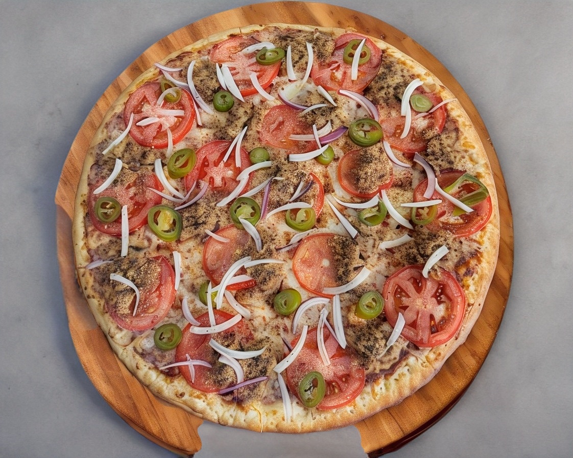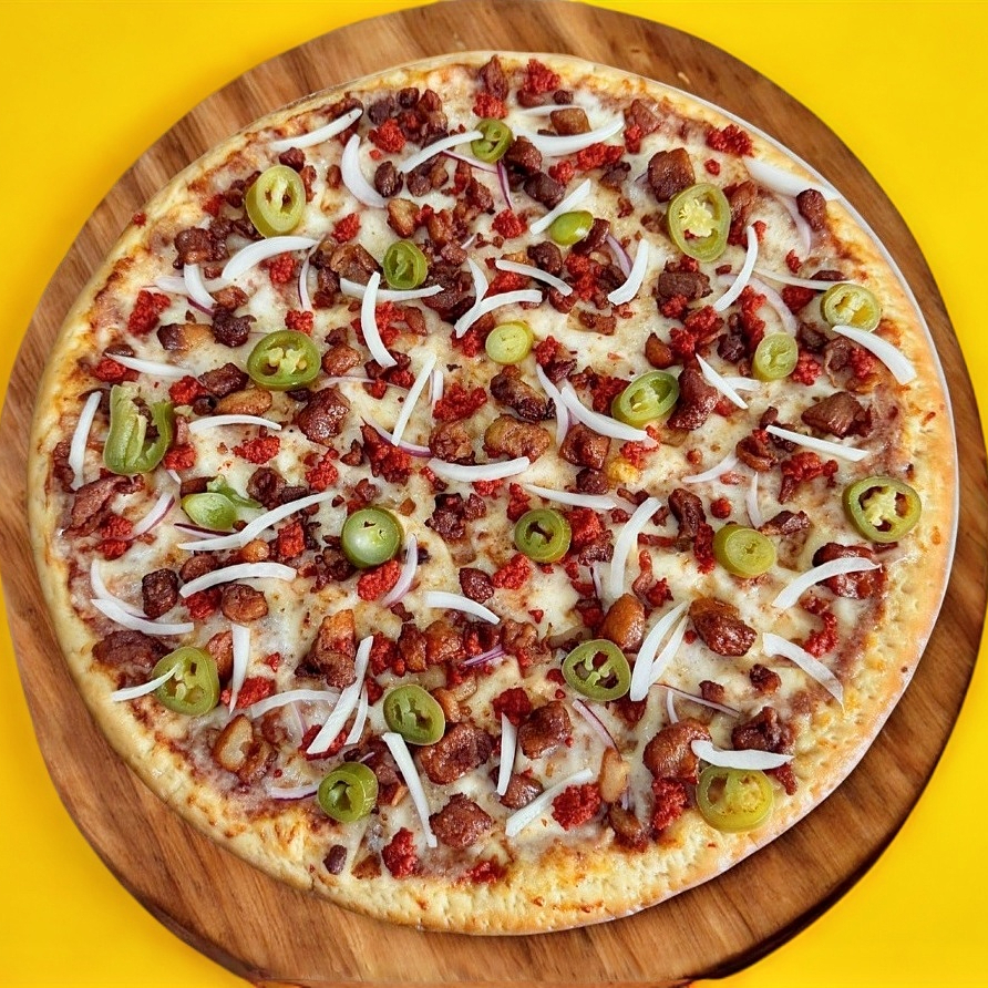 Salsa de tomate, queso, pepperoni, aceituna, salchicha italiana, pimiento verde y cebolla morada.