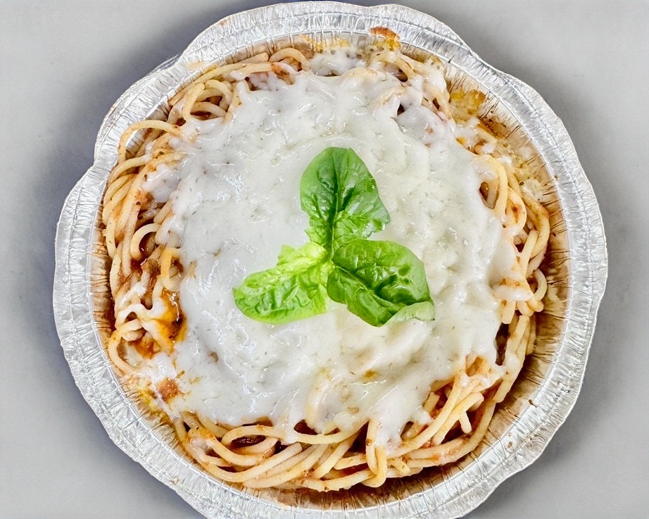 Salsa de tomate especial, queso gratinado y albahaca al top.