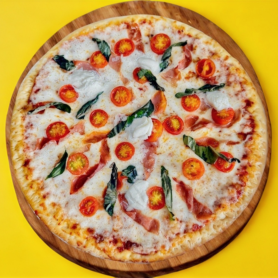 Salsa de tomate, jamón serrano, tomate cherry, albahaca y burrata.
