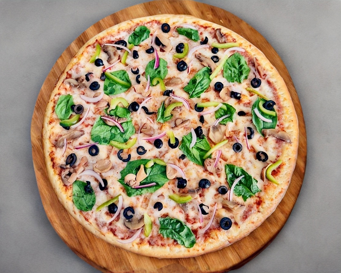 Salsa de tomate, queso mozarella, champiñones, aceituna negra, pimiento verde, cebolla morada y espinaca .