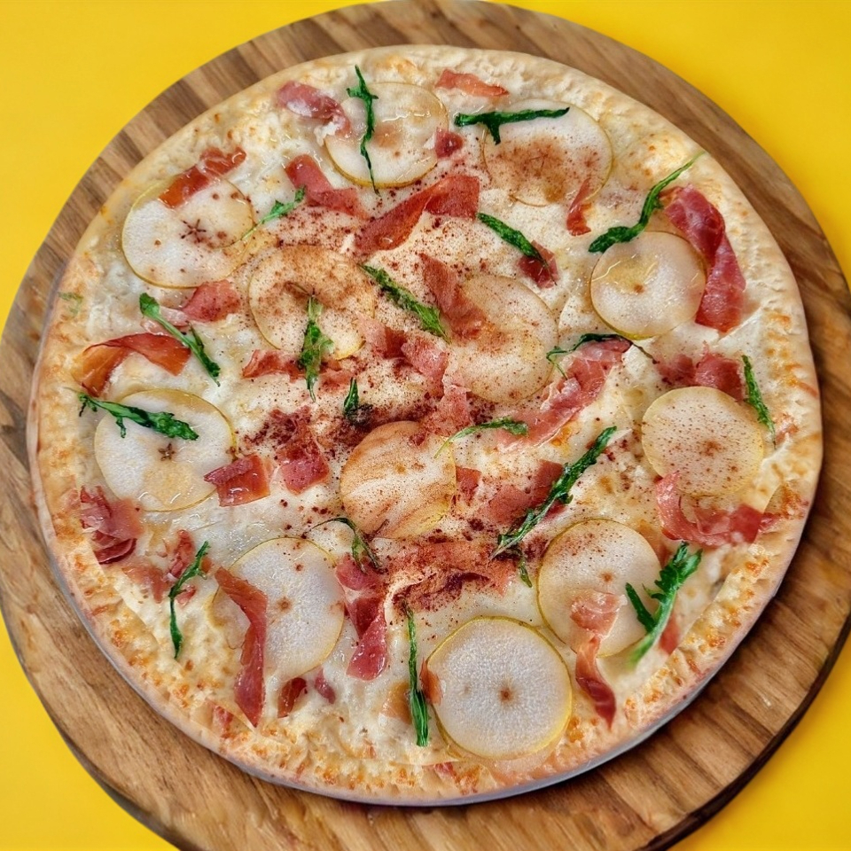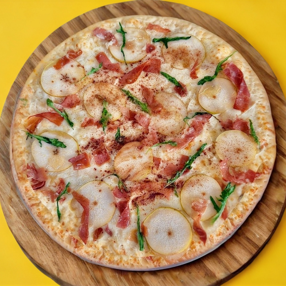Base de burrata, queso mozarella, pera, jamón serrano, urúgula, miel y canela.