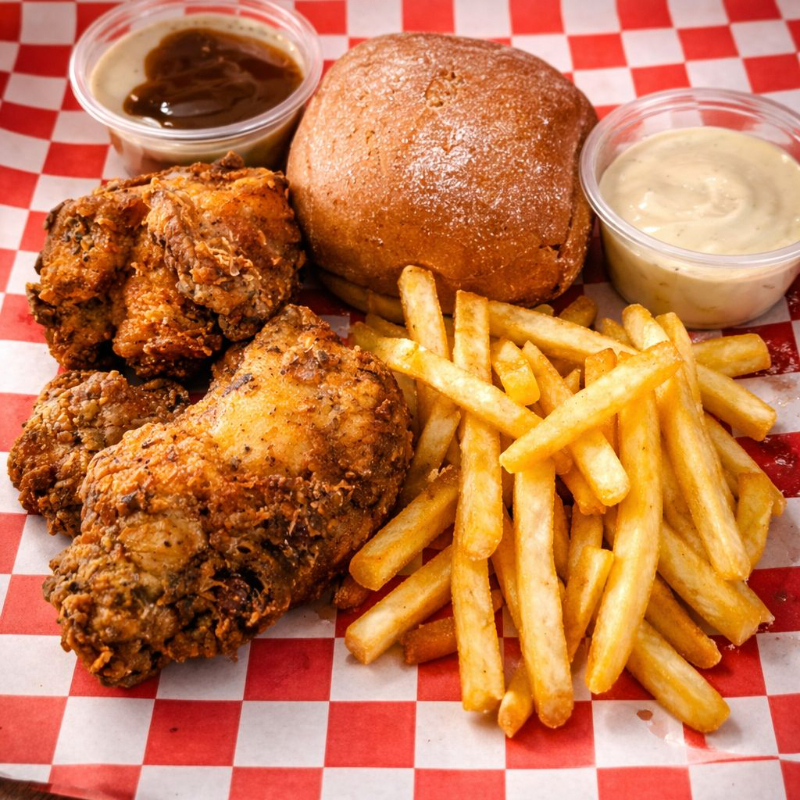 Biscuit*1 + Orden De Papas Fritas*1 + Puré De Papa*1 + Pieza De Pollo*2 + Aderezo De la casa*1
