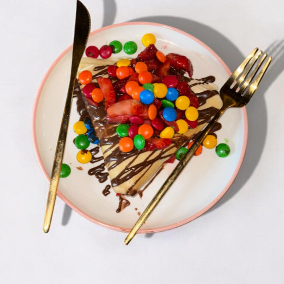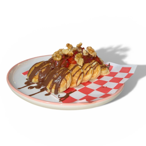 20 piezas de minipancakes, platano o fresa, 1 jarabe + 1 topping