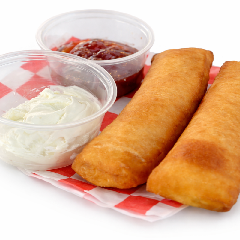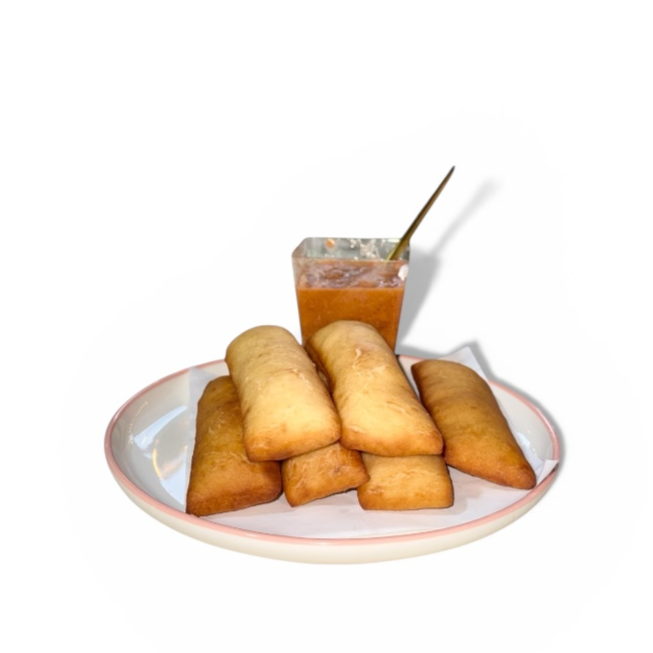 6 piezas de chimangos acompañados de un vaso de queso philadelphia y mermelada