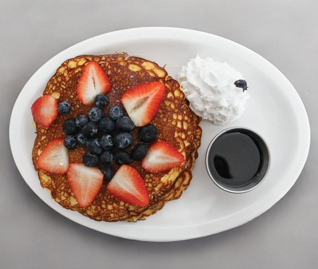 Huevo, harina de almendras, queso crema y mantequilla. Acompañado de tocino y miel sugar free.