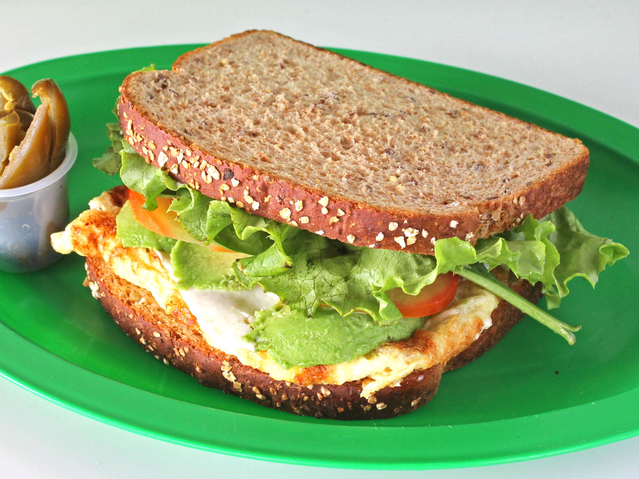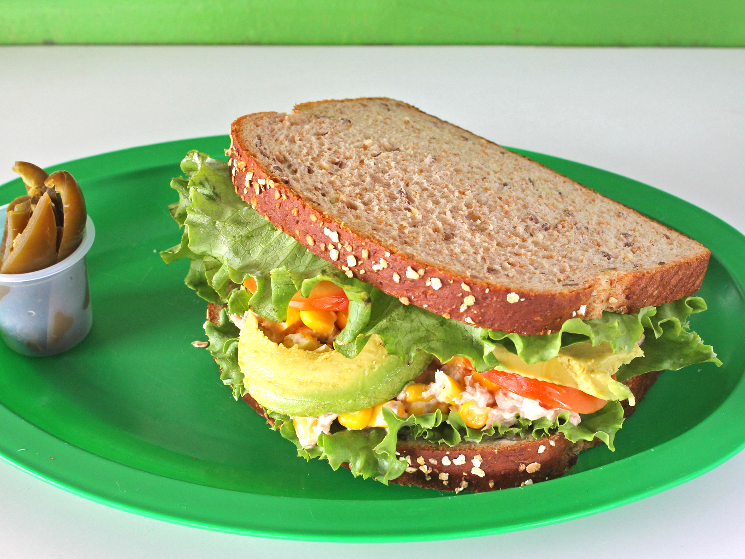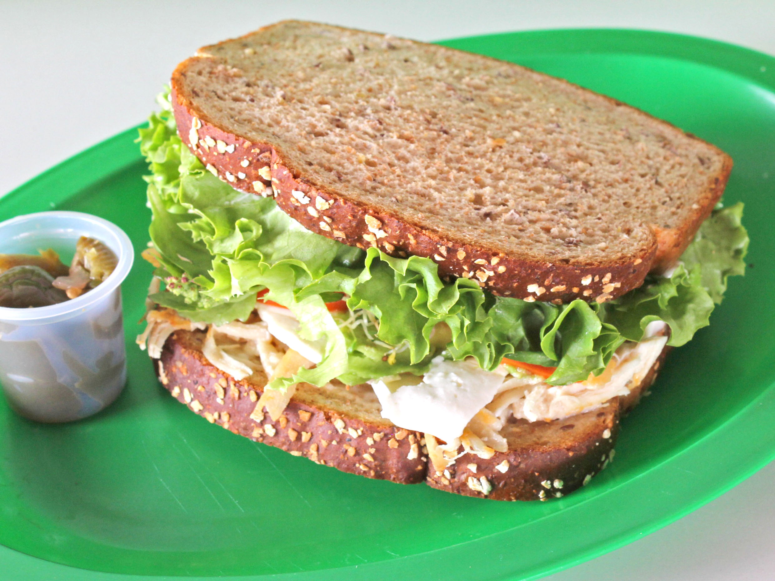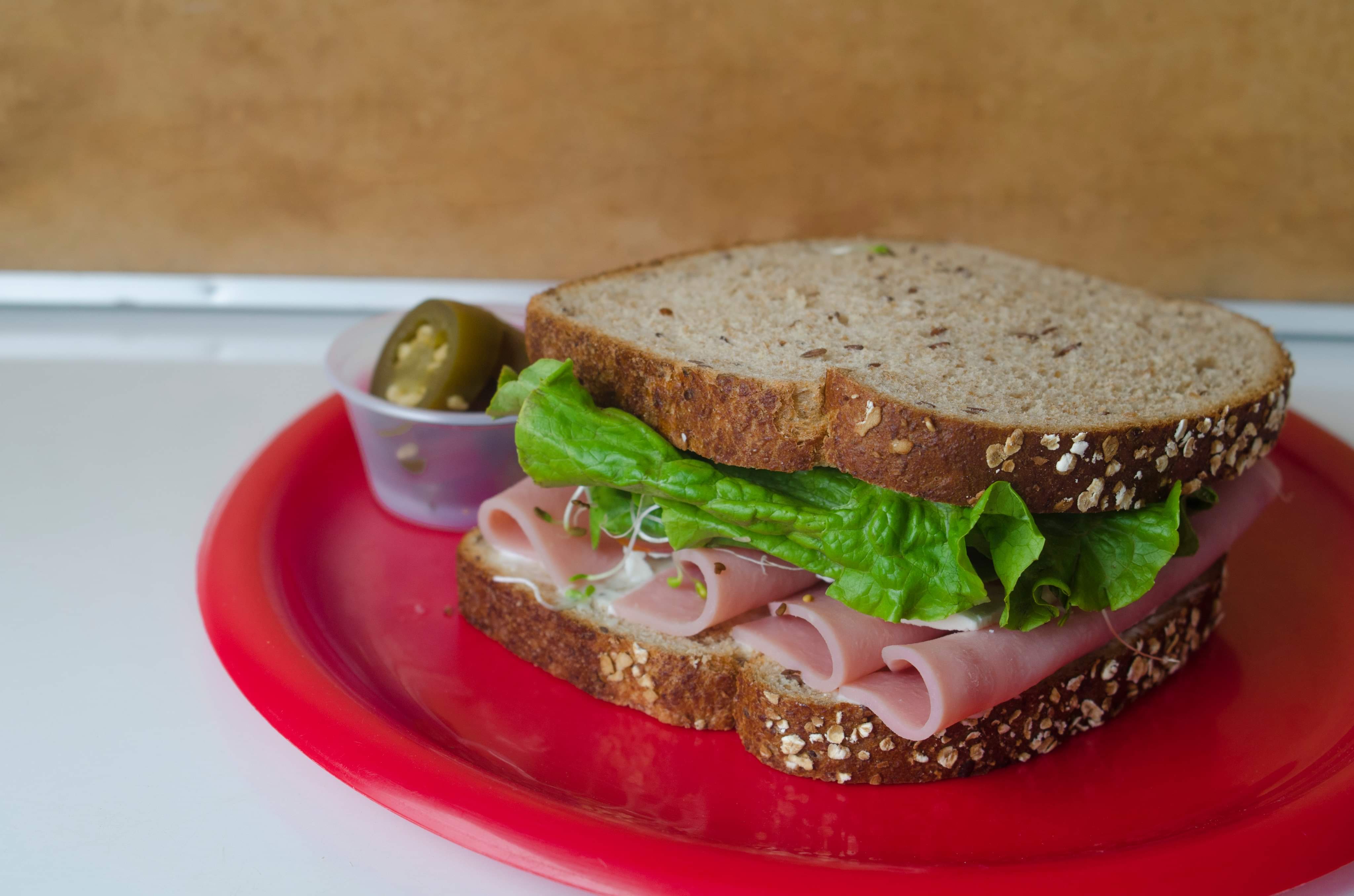 Pan de grano, jamón de pavo, lechuga romana, tomate, espinaca, queso panela, germinado de alfalfa y aguacate.