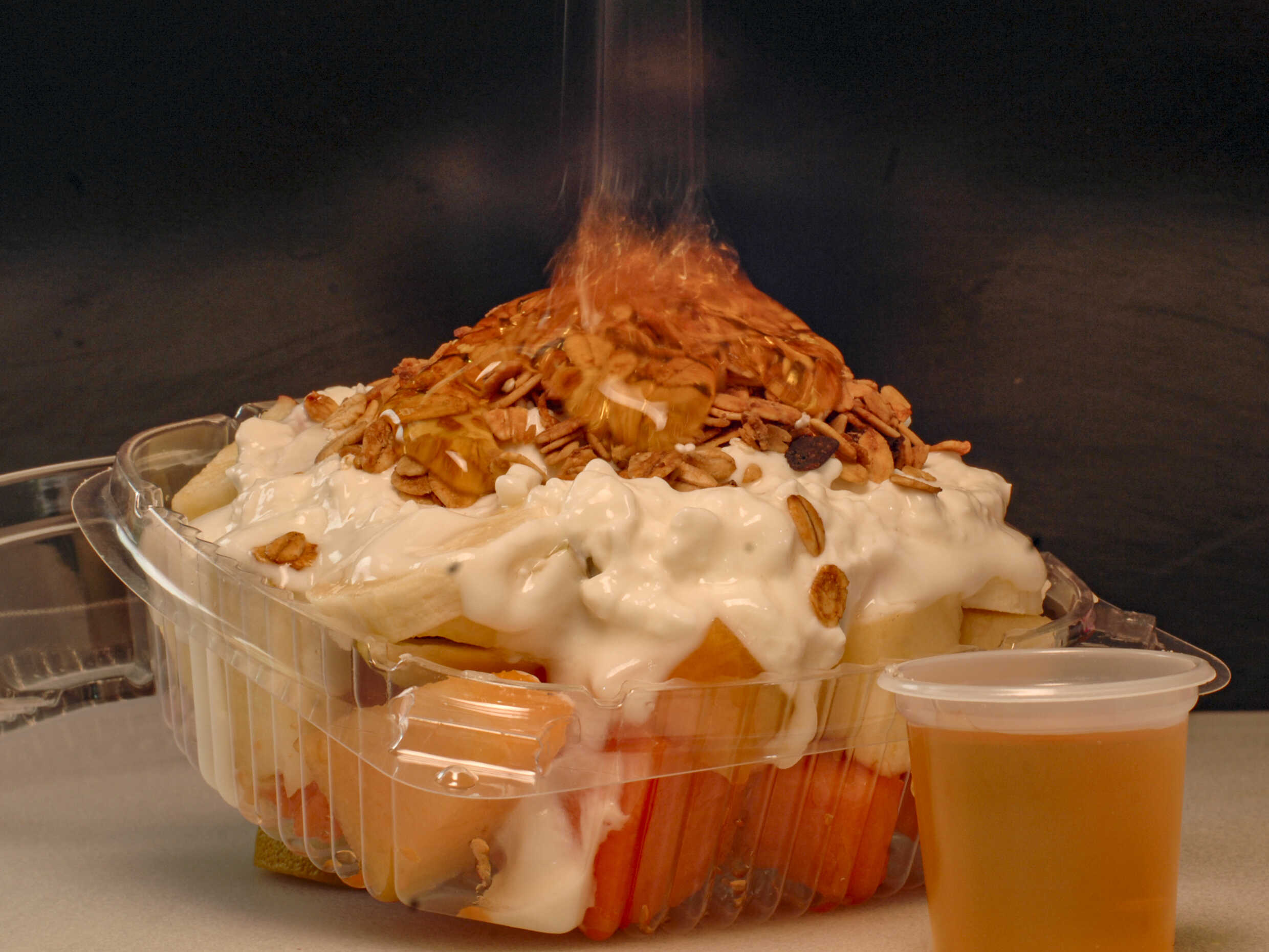 Fruta de temporada, miel, granola y queso cottage.