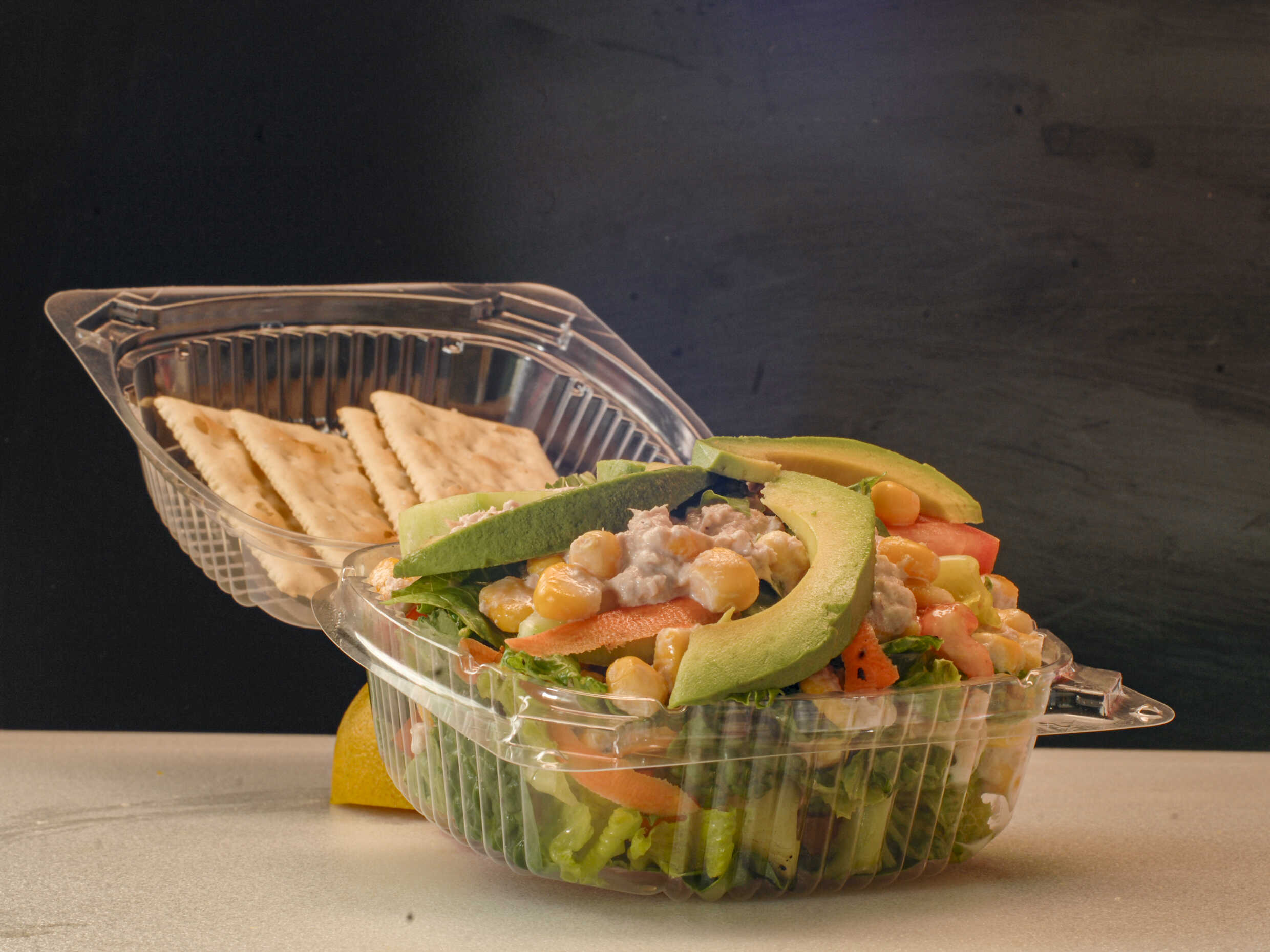 Lechuga, espinaca, elote, tomate, mayonesa, atún y aguacate.