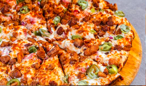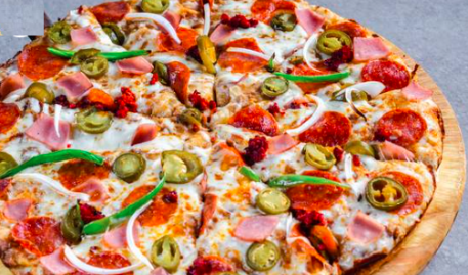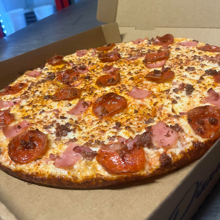 Con pepperoni, champiñones, tocino, salchicha italiana, aceituna negra, pimiento morrón, cebolla blanca.
