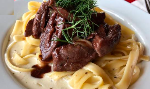 Fetuccine en salsa alfredo con arrachera marinada en reducción de vino tinto
